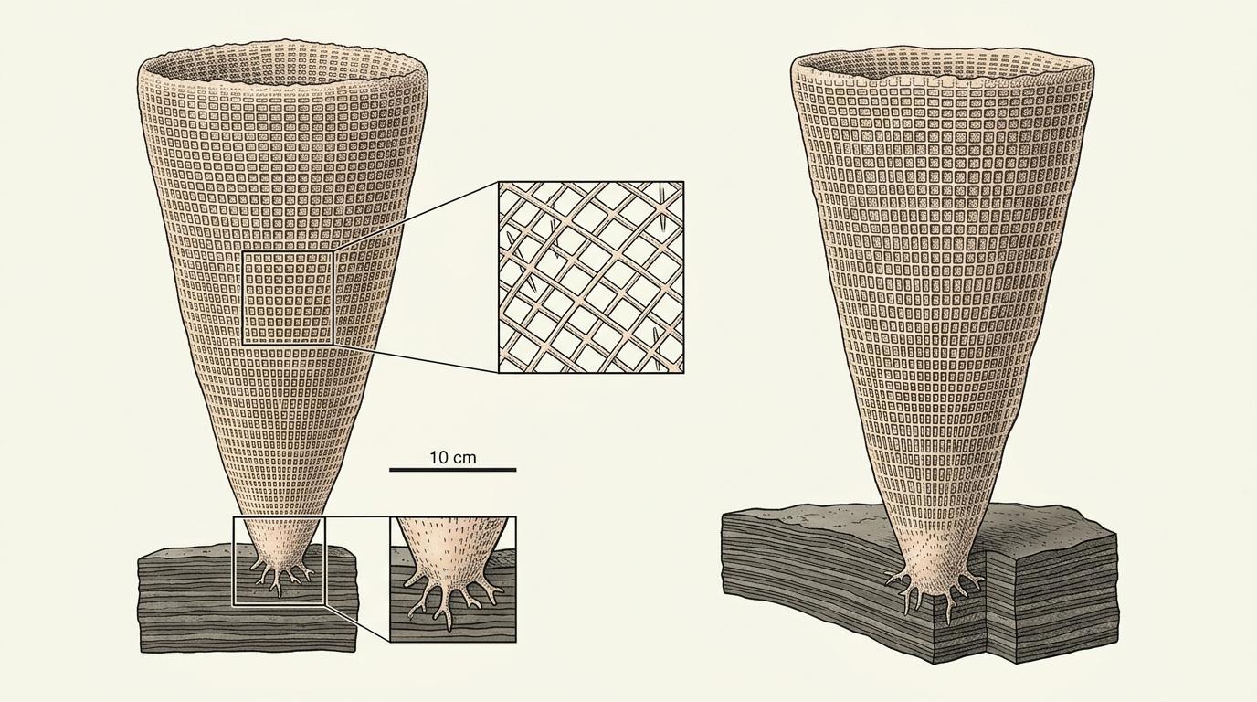它的尺寸更让人意外:足足38厘米长,差不多是一本大词典的长度。在此之前,科学家默认早期海绵都只有指甲盖大,结构简单得像一团乱麻。但这块化石的锥形身体、规则网格,甚至底部的固着结构都清晰可见,证明早在寒武纪大爆发之前,海绵就已经进化出了复杂的身体形态。