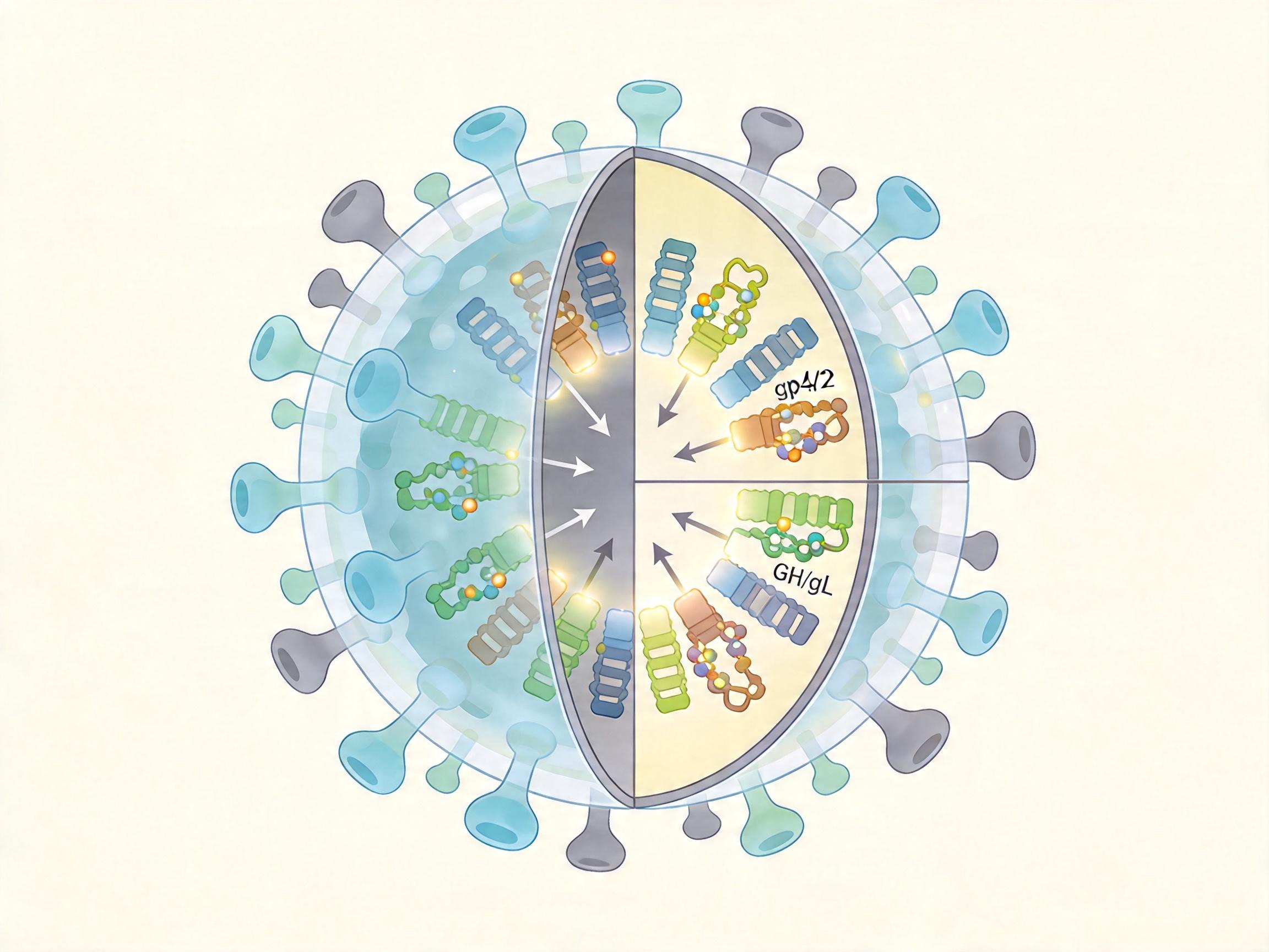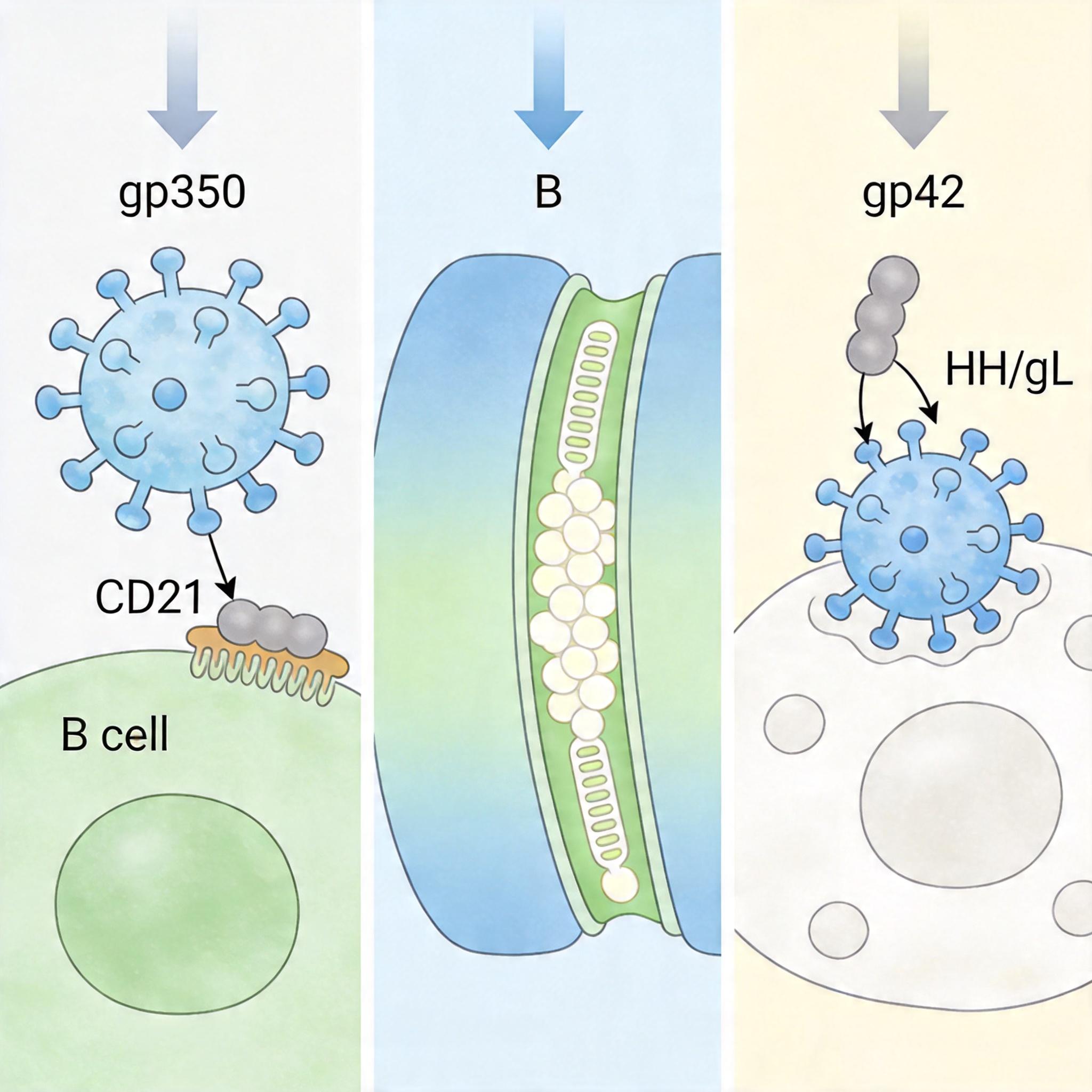 EBV的狡猾,在于它能精准撬开两种人类细胞的大门:B淋巴细胞和上皮细胞。这两把“锁”的钥匙,是病毒表面的gp350和gp42蛋白。 你可以把gp350想象成病毒的“敲门砖”——它先和B细胞表面的CD21受体结合,让病毒牢牢贴在细胞上;而gp42则是“开门的密码”,它会对接B细胞表面的HLA-II分子,触发病毒包膜和细胞膜的融合,让病毒的遗传物质趁机溜进去。更棘手的是,gp42还能切换模式:当它和病毒表面的gH/gL复合物结合时,会反过来抑制病毒感染上皮细胞,帮病毒实现“精准靶向”。
