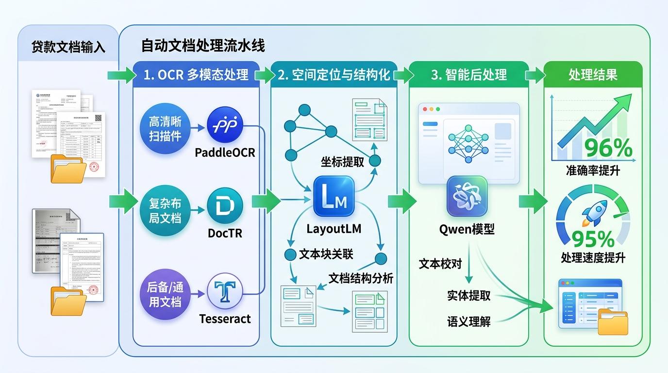 有团队用这套思路搭建了贷款文档处理流水线:用PaddleOCR处理清晰扫描件,DocTR应对复杂布局,Tesseract当后备,LayoutLM做空间定位,最后用Qwen模型做后处理,准确率直接冲到96%,处理速度提升了95%。