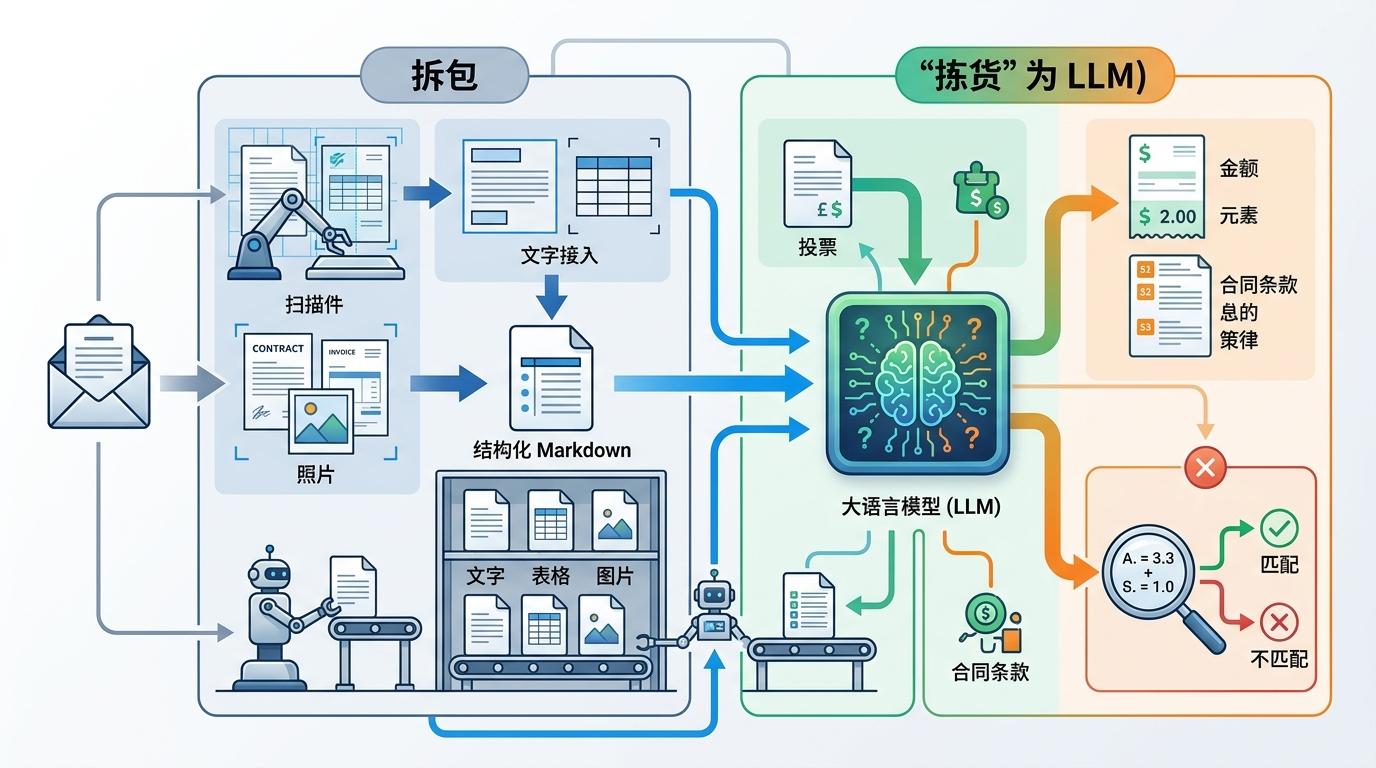 你可以把混合管道理解成一家分工明确的文档加工厂:第一步,由OCR(光学字符识别)或布局模型负责「拆包」——把扫描件、照片里的文字、表格、图片位置精准识别出来,转换成结构化的Markdown格式,就像把混乱的仓库整理成货架上的商品;第二步,大语言模型(LLM)负责「拣货」——根据业务需求从结构化文本里提取关键信息,比如发票的金额、合同的条款,还能做逻辑推理,比如核对发票金额和税率是否匹配。