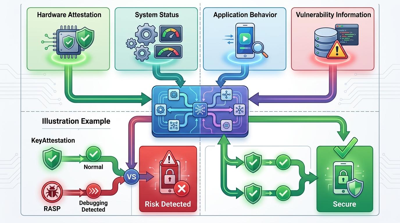这就是为什么MDVM必须是「多信号融合」的系统:它不会只看单一的检测结果,而是把硬件认证、系统状态、应用行为、漏洞信息等多维度数据交叉验证。比如当KeyAttestation显示设备状态正常,但RASP检测到应用正在被调试,MDVM依然会判定设备存在风险。
