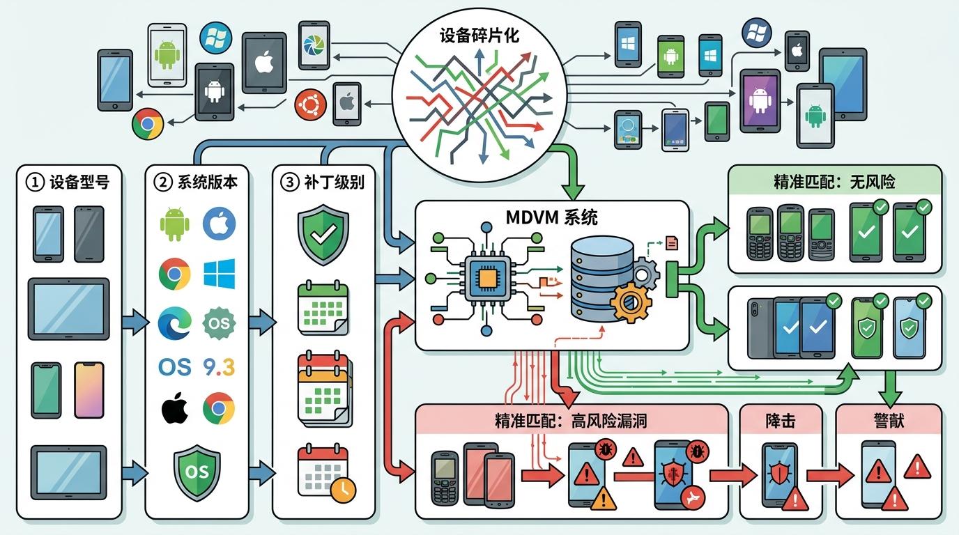 更关键的是,MDVM解决了移动设备的「碎片化难题」——全球有超过2万种不同型号的安卓设备,系统版本和补丁更新参差不齐。MDVM会根据设备型号、系统版本、补丁级别精准匹配漏洞信息,不会因为一台三年前的旧手机没更最新系统就一刀切,也不会放过任何一台存在高风险漏洞的新机型。