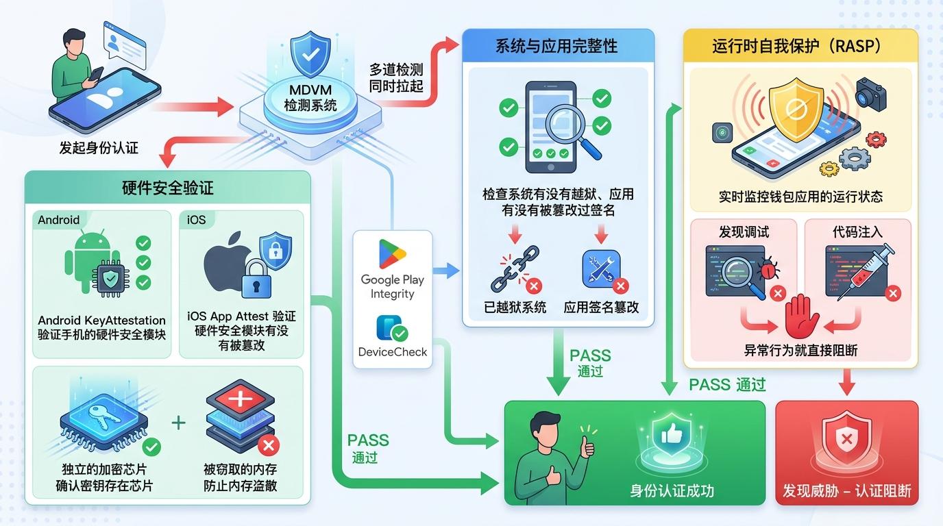 当你发起身份认证时,MDVM会同时拉起多道检测:先通过Android KeyAttestation或iOS App Attest验证手机的硬件安全模块有没有被篡改,确认密钥是存在独立的加密芯片里而非可被窃取的内存;再调用Google Play Integrity或DeviceCheck,检查系统有没有越狱、应用有没有被篡改过签名;最后通过RASP(运行时自我保护)技术,实时监控钱包应用的运行状态,一旦发现调试、代码注入等异常行为就直接阻断。