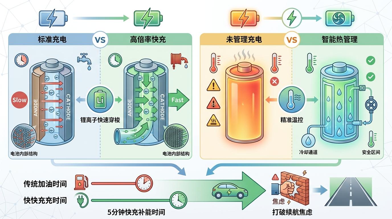 但真正让消费者下定决心的,是动力电池技术的突破。这次实现5分钟快充的核心,是高倍率电芯与智能热管理系统的协同——可以把它类比为给水管换了粗口径管道,同时加装了精准的水压温控阀:前者让锂离子能以数倍速度在电池内部穿梭,后者则把快充产生的热量牢牢控制在安全区间,避免电池老化加速。这项技术的意义在于,它第一次把电动车的补能时间,压缩到了和燃油车加油接近的量级,直接击碎了“续航焦虑”的最后一道防线。
