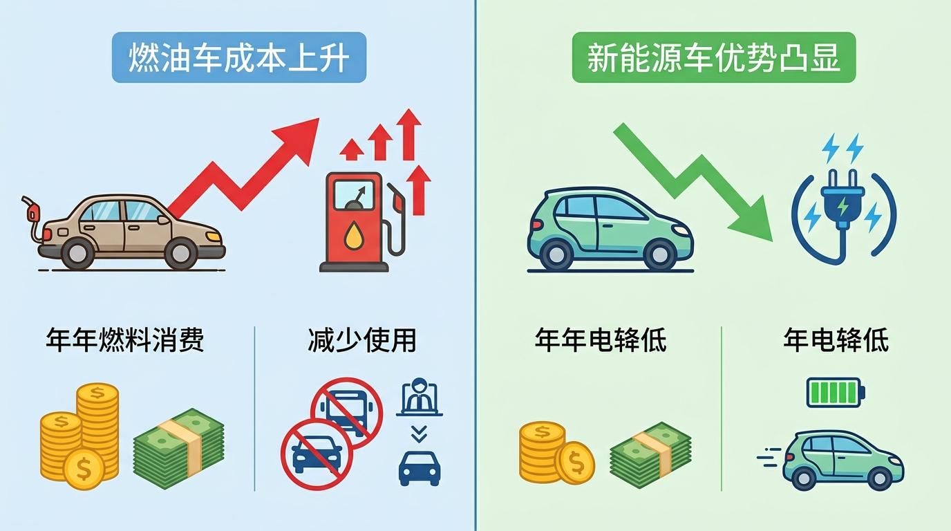 先看油价这根杠杆。过去一个月,国际油价涨幅超过40%,直接把燃油车的使用成本抬到了新高度:一辆普通燃油车的年油费支出,较之前增加了近四分之一。多国政府紧急出台政策——远程办公倡议、临时免费公交、燃油车限行——本质上是用行政手段缩小燃油车的生存空间。而新能源汽车的运营成本优势,在这一刻被放大到肉眼可见:同样的年行驶里程,电动车的电费支出仅为燃油车的三分之一。