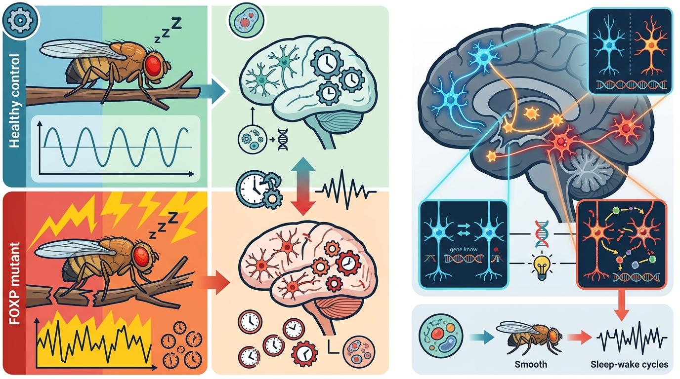 在果蝇实验里,携带FOXP变异的个体不仅睡眠碎片化,连体内的生物钟基因表达都出现了紊乱——就像钟表的齿轮被掰歪了,走得忽快忽慢。研究团队还发现,这种影响不是全身性的,而是精准地瞄准了大脑里调控昼夜节律的神经元群。