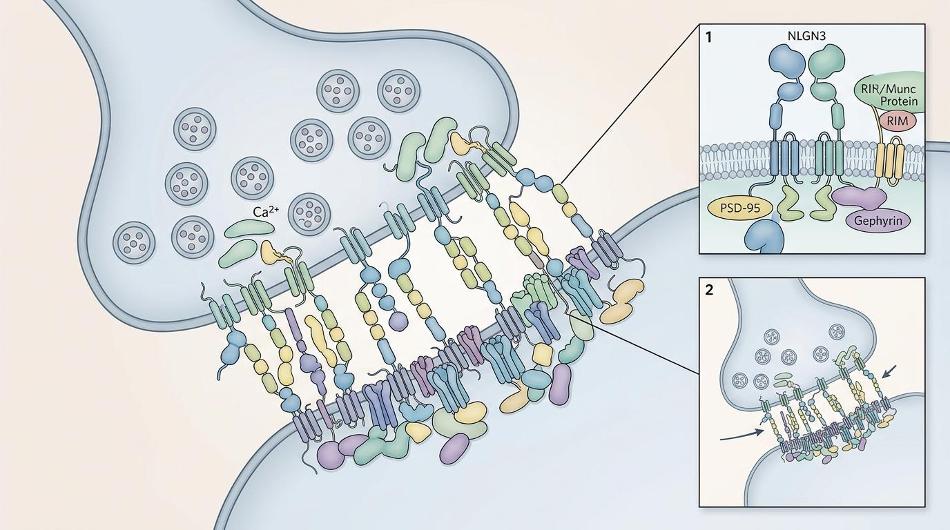 如果说FOXP是睡眠的“总调度”,那NLGN3就是突触的“装修工”。这种位于神经细胞表面的黏附分子,负责把两个神经元粘在一起,搭建起传递信号的突触——你可以把它想象成连接两个房间的门,门的好坏直接决定了信号能不能顺畅传递。