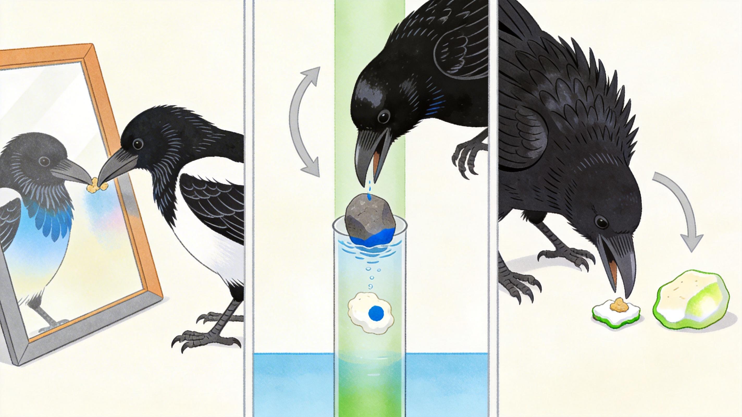 科学家给鸟做“智商测试”的方式,比给人类测IQ还讲究。镜像测试里,欧亚喜鹊会对着镜子啄掉自己身上的彩色标记——这是自我意识的证明,而狗和猫大多过不了这关;伊索寓言实验中,新喀里多尼亚乌鸦会把石头丢进窄管,靠升高水位够到浮在水面的食物,还能分清沉底的重物和没用的轻飘物;延迟满足测试里,渡鸦能忍住眼前的小零食,等10分钟换更大的奖励,自控力比不少盯着薯片碗的人类还强。