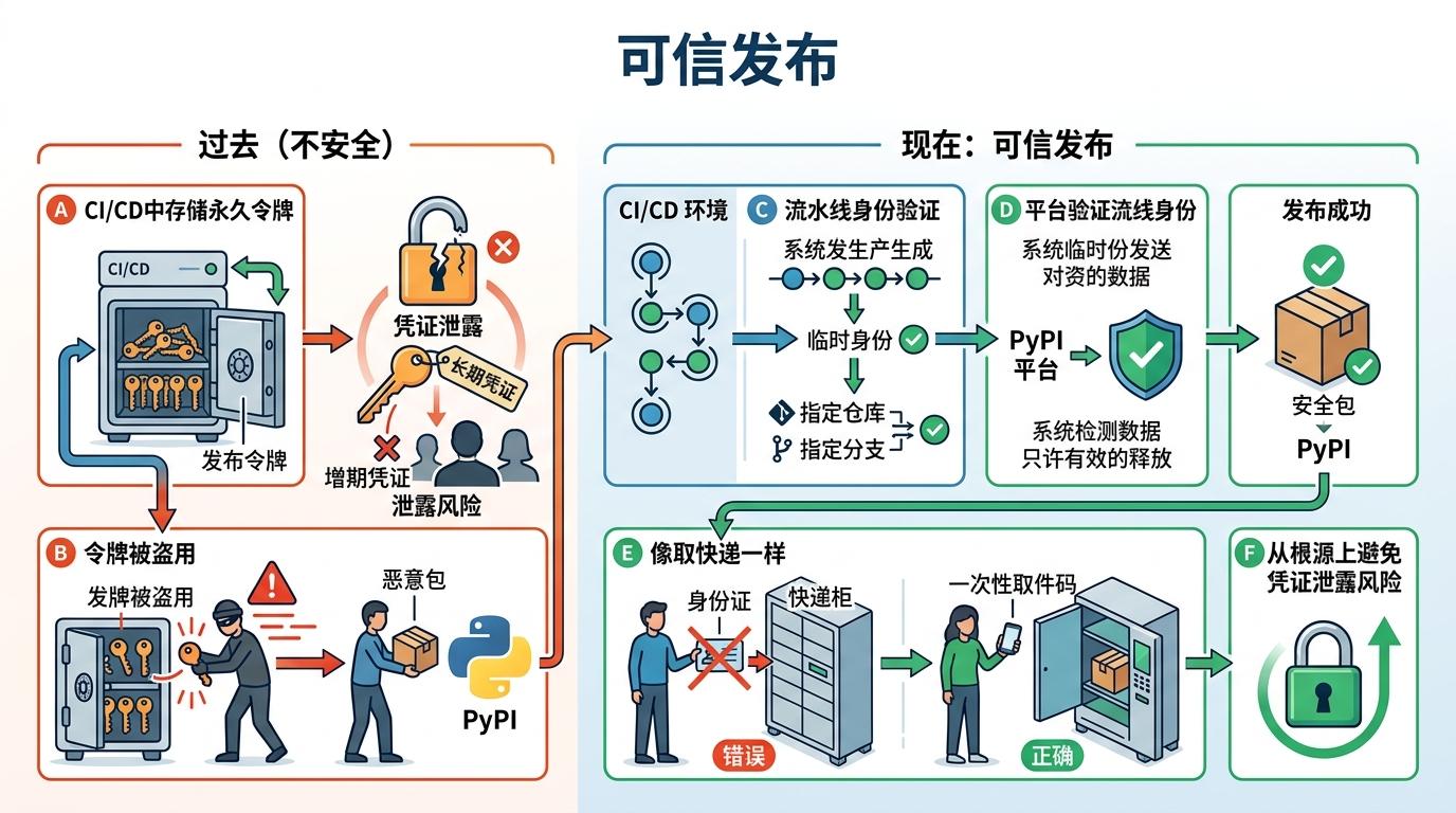 第一个是**可信发布(Trusted Publishing)**——它彻底淘汰了长期凭证,改用临时身份认证。比如向PyPI发布包时,不再需要在CI/CD中存储永久的发布令牌,而是由平台直接验证流水线的身份:只有来自指定仓库、指定分支的流水线,才能完成发布。就像你取快递时,不用把身份证留在快递柜,只需要出示一次性取件码,从根源上避免了凭证泄露的风险。