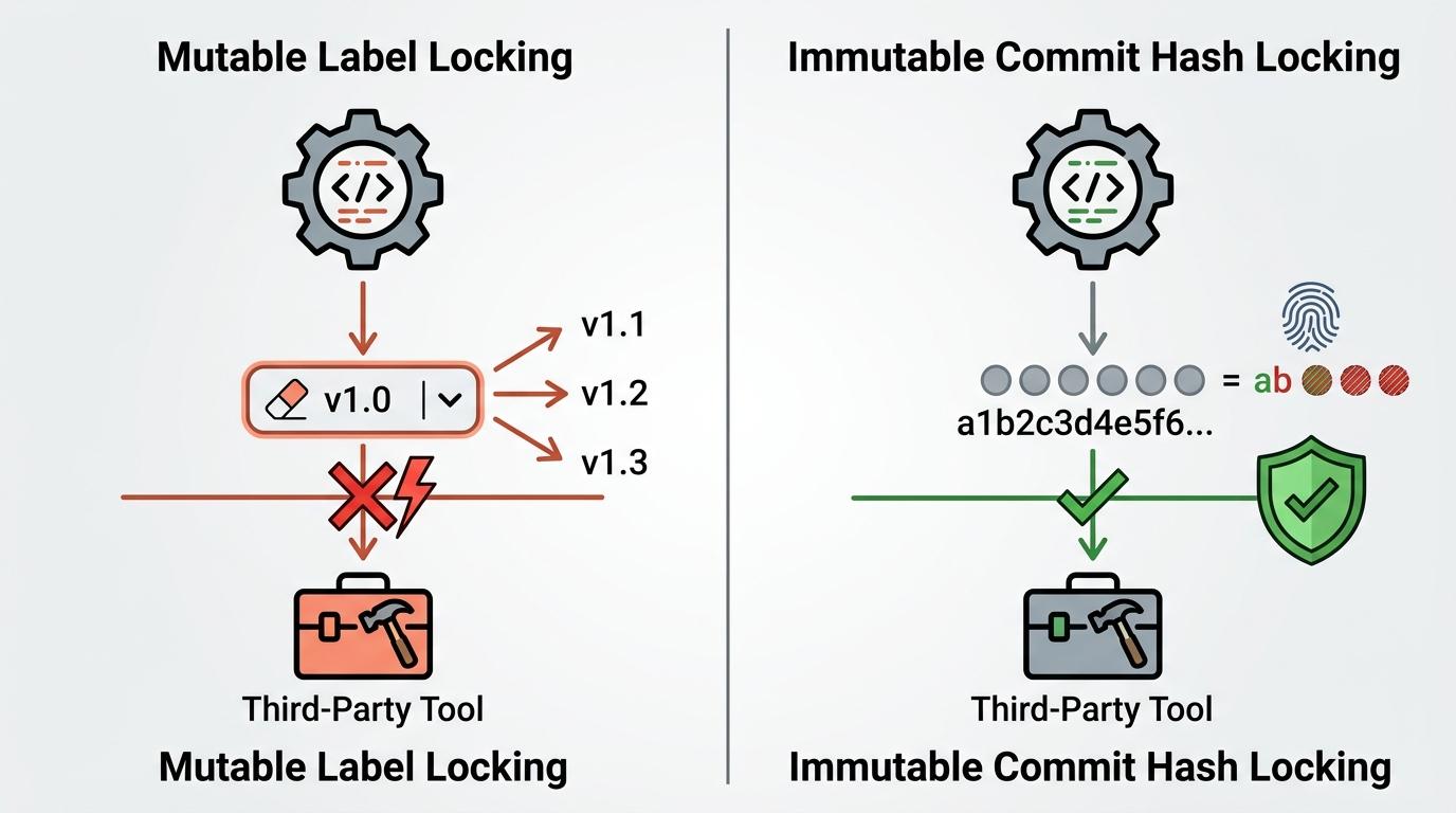 第二个是**不可变的版本锁定**——所有第三方工具必须绑定到具体的提交哈希(SHA),而不是“v1.0”这样的可变标签。哈希是代码的“数字指纹”,一旦代码被篡改,哈希就会完全不同。Astral团队的实践显示,这个简单的规则能直接阻断80%以上的标签投毒攻击。