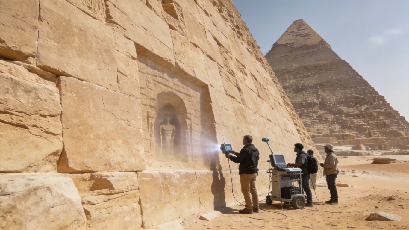 当吉萨高原的朝阳把孟卡拉金字塔的东侧花岗岩面擦得发亮时,没人能想到,这层打磨得和北侧入口如出一辙的光滑石面后,藏着两个沉睡了四千多年的空气空洞。2026年,开罗大学与慕尼黑工业大学的联合团队,用三种非侵入式技术敲开了这个秘密——这是学界首次拿到东侧存在第二入口的实锤证据。为什么偏偏是现在?那些看不见的「透视眼」,到底是怎么穿透百吨巨石的?