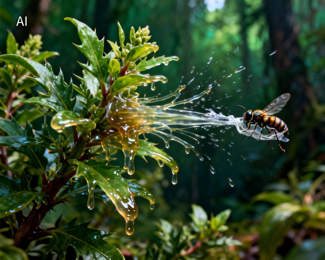 在静谧的热带丛林中,一只甲虫正准备享用一顿鲜美的绿叶大餐。然而,当它咬下第一口的瞬间,一场突如其来的反击爆发了。叶片仿佛变成了一支高压水枪,猛地喷射出一股黏稠的液态树脂,精准地命中这名“入侵者”。这股树脂不仅气味刺鼻、带有剧毒,更在接触空气的瞬间迅速凝固,将小一点的昆虫直接封印在一座琥珀般的“坟墓”里。即使是体型较大、侥幸逃脱的昆虫,也会因这次致命的“洗礼”而生长迟缓、寿命缩短。这并非科幻电影的场景,而是布氏鼠李(Bursera)属植物每天都在上演的真实防御战。它那遍布叶片的树脂管道网络,如同一个预先埋设好的防御系统,一旦被咬破,压力便会瞬间释放,将致命的化学武器喷射至1.5米之远。这场面,为我们揭开了一场持续了数亿年的、遍布全球的植物与昆虫间的“化学武器”进化博弈的序幕。