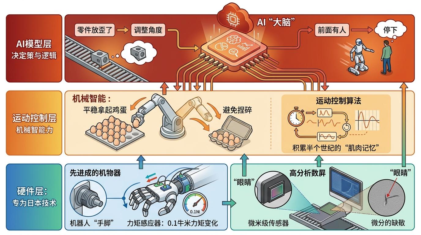 你可以把物理AI的运作逻辑拆解成三层:最底层是日本最擅长的硬件,比如能感知0.1牛米力矩变化的执行器,能识别微米级缺陷的传感器,这些是机器人的“手脚”和“眼睛”;中间层是运动控制系统,它能让机械臂像人手一样平稳拿起鸡蛋又不会捏碎,这是日本积累了半个世纪的“肌肉记忆”;最上层是AI模型,它能处理传感器传来的海量数据,判断“这个零件放歪了,我要调整角度”“前面有人,我得停下”,这是让机器拥有“大脑”的关键。