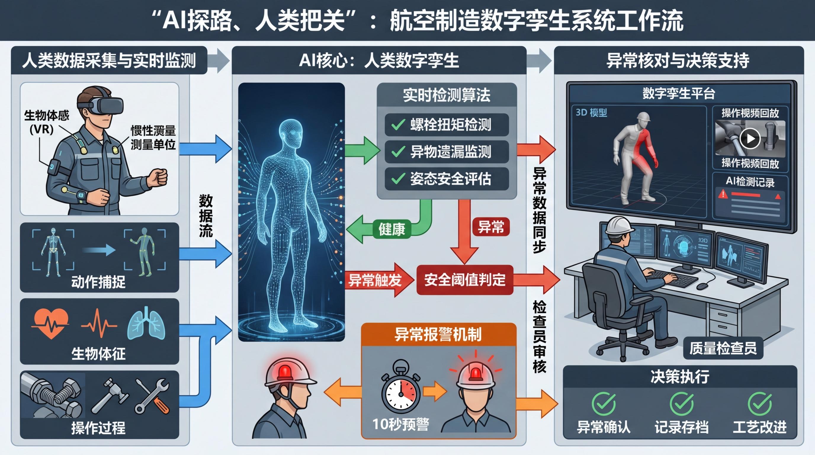这种“AI探路、人类把关”的模式,正从航天领域渗透到航空工业的每一个环节。在飞机制造车间,SMU团队开发的“人类数字孪生”系统,会通过VR头盔和生物传感器,实时捕捉工人的操作姿态、心率变化,AI算法则同步检测螺栓紧固的扭矩是否达标、是否有异物遗漏。一旦发现工人的倾斜角度超过安全阈值,系统会在10秒内发出预警,同时把操作视频和AI检测记录同步到数字孪生平台,质量检查员只需核对异常数据,不用全程紧盯流水线。