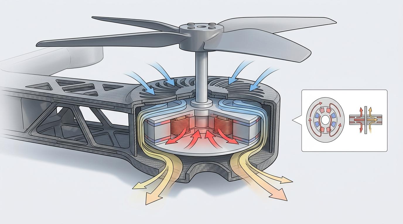 但轻只是第一步,小机身里的动力系统才是真正的难题。多旋翼无人机靠电机驱动螺旋桨,电机越小,散热越难,功率密度就成了核心指标——就像在火柴盒里塞一台发动机,还要保证它不烧起来。轴向磁通电机的出现解决了这个问题,这种扁平的盘状电机磁路更短,能在相同重量下输出更强的扭矩,配合对称进气格栅设计,让气流顺着机身结构穿过电机,把热量及时带走。