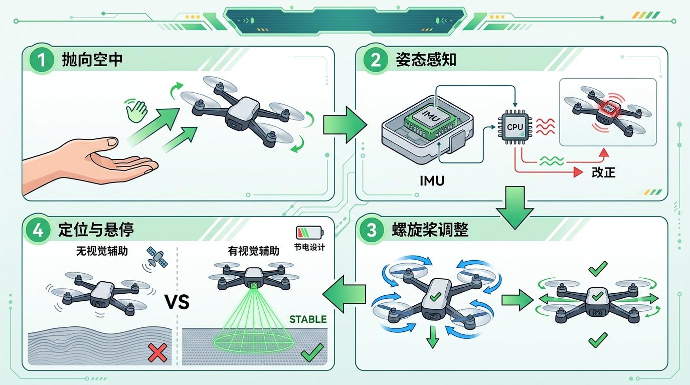 掌上发射的安全感,从来不是靠手稳,而是靠算法兜底。当你把无人机抛向空中的瞬间,它的IMU传感器会在几毫秒内捕捉姿态变化,自动调整螺旋桨转速,让机身从翻滚状态快速回正。新一代的系统还加入了视觉辅助,机身底部的摄像头会识别地面纹理,就算GPS信号丢失,也能靠视觉定位保持悬停。但这一切都要在低功耗下运行,毕竟小机身里的电池,容不下太耗电的计算模块。