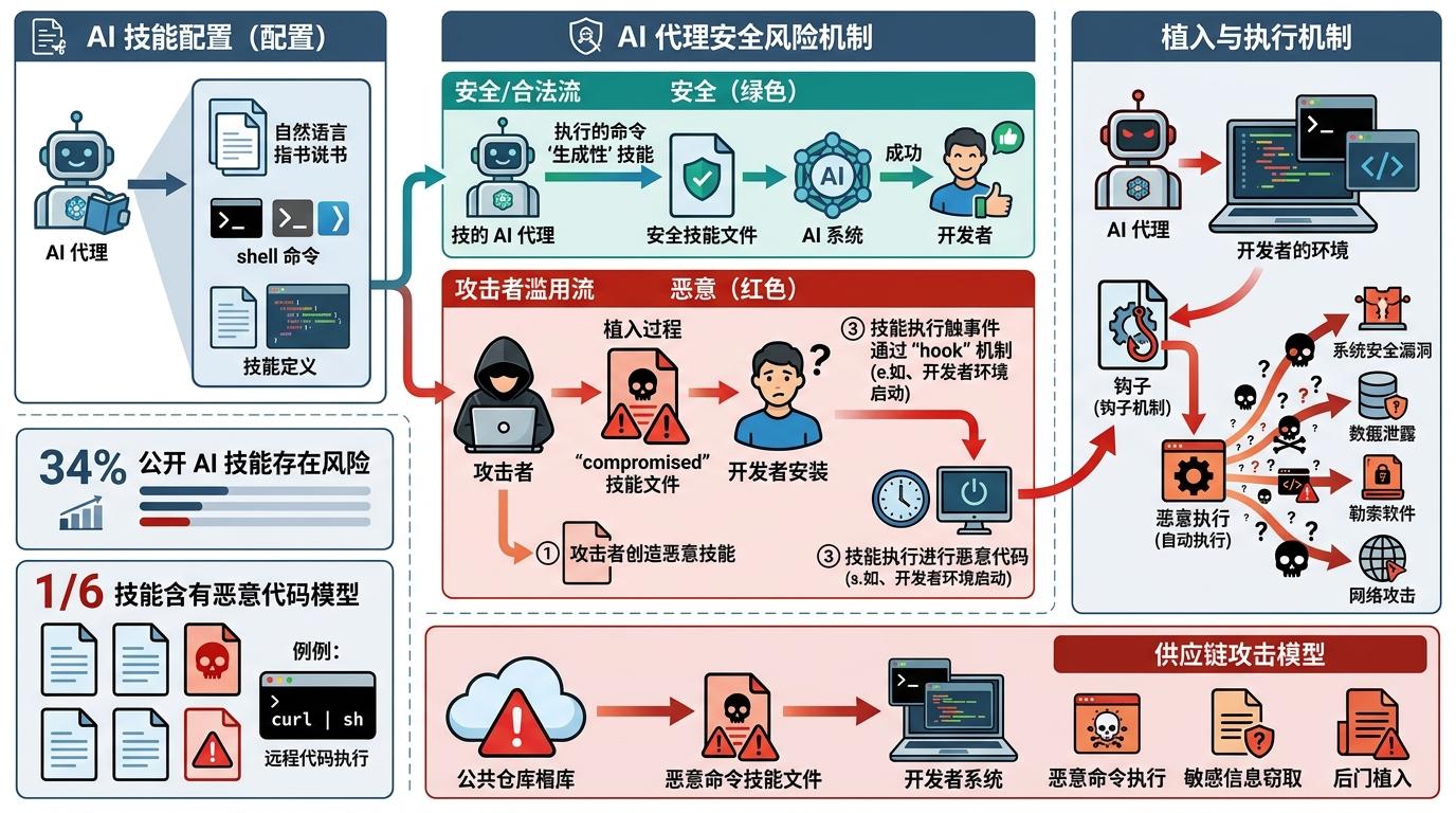 AI代理依赖「技能」文件——一种包含自然语言指令和Shell命令的配置文件——来完成复杂任务。但安全审计发现,34%的公开AI技能存在安全风险,1/6的技能含有「curl | sh」这种经典的恶意执行模式。攻击者可以伪装成合法的「生产力工具」技能,诱导开发者安装,然后在技能的「钩子」机制里植入恶意代码,每次开发环境启动时自动执行。
