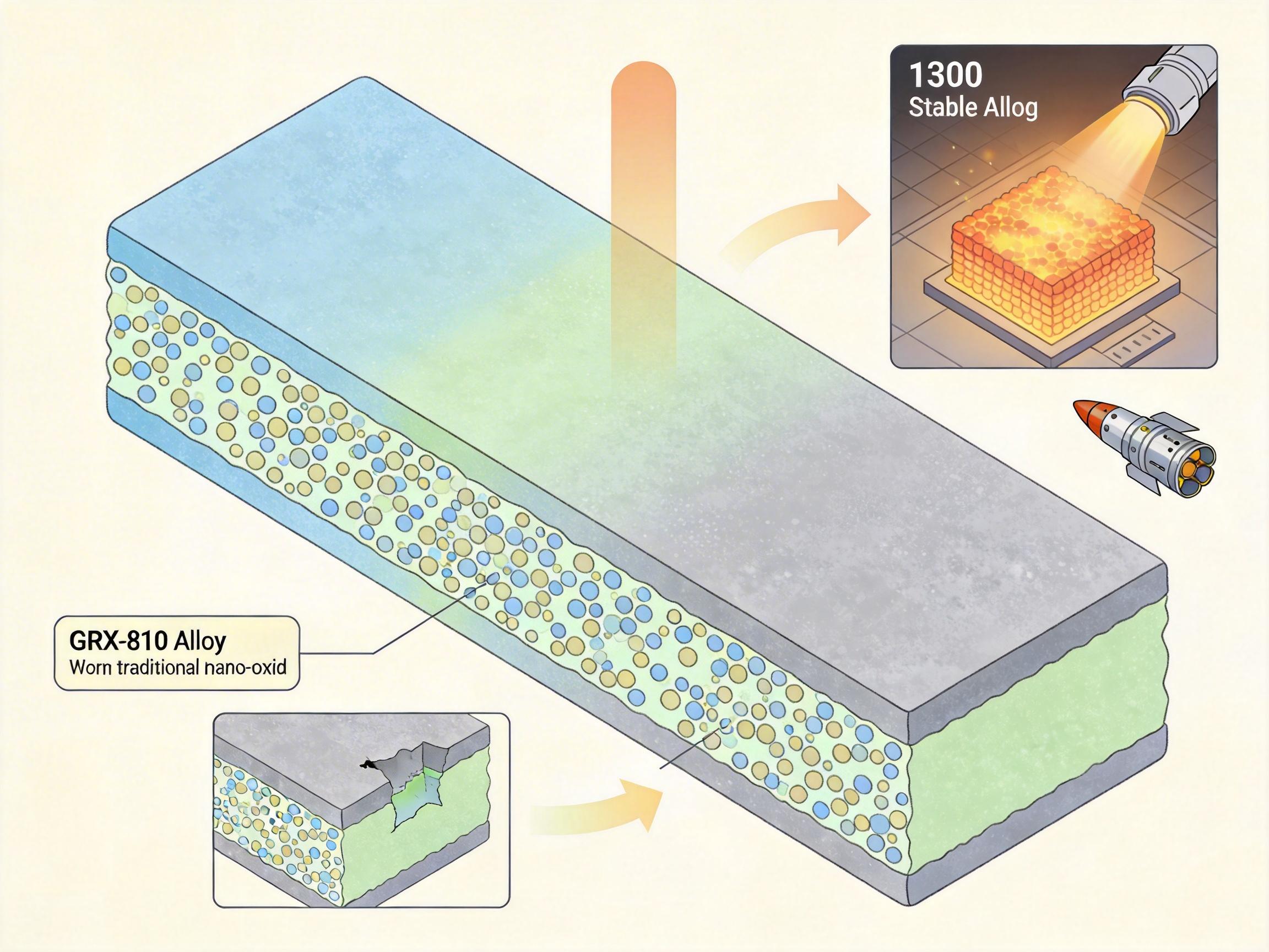 GRX-810采用3D打印和冷喷涂工艺制造,能在1300℃的高温下长期稳定工作,寿命是传统合金的数倍。它的秘密在于纳米氧化物弥散强化技术——把纳米级的氧化物颗粒均匀「镶嵌」在金属基体里,就像在混凝土里加入钢筋,既提升了高温强度,又增强了抗腐蚀能力。这种材料已被用于制造火箭发动机的关键部件,直接提升了火箭的重复使用次数,降低了发射成本。