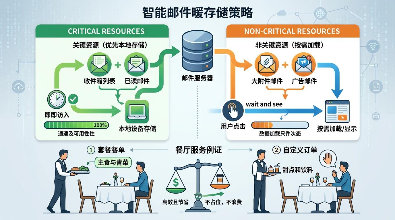 更聪明的是它的缓存策略:它把邮件分成了“关键”和“非关键”两类。收件箱列表、已读邮件是关键资源,优先存在本地;而那些带大附件的邮件、广告邮件,只有当你主动点击时才会加载。这种“按需加载”的思路,就像你去餐厅吃饭,先上主食和青菜,甜点和饮料等你要了再上,既不占肚子,也不浪费钱。