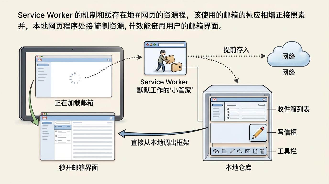 这个“随身仓库”就是Service Worker,一个在浏览器后台默默工作的“小管家”。它会把邮箱最核心的界面框架——比如收件箱列表、写信框、工具栏——提前存在你的设备里,就像你家里常备的碗筷,不用每次做饭都去超市买。等你下次打开邮箱,它直接从本地调出这些框架,不用再从网络下载,这就是为什么它能秒开。