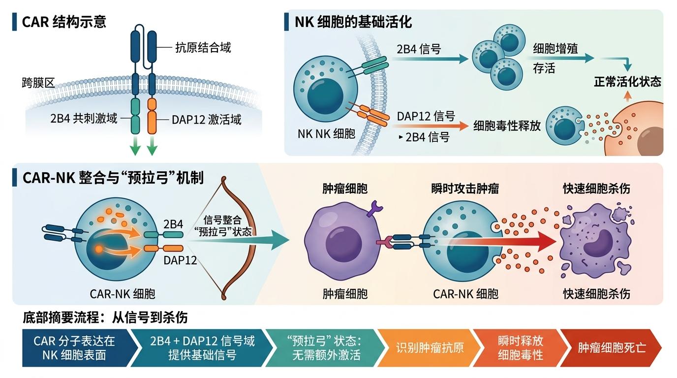 简单说,2B4负责给NK细胞“打气”,让它们持续增殖、保持兴奋;DAP12负责“踩油门”,让它们立刻释放毒素、杀死肿瘤。当这两个信号域被整合进CAR结构后,NK细胞就像被提前拉满了弓——不需要额外的激活信号,只要一碰到肿瘤细胞,就能瞬间发起攻击。