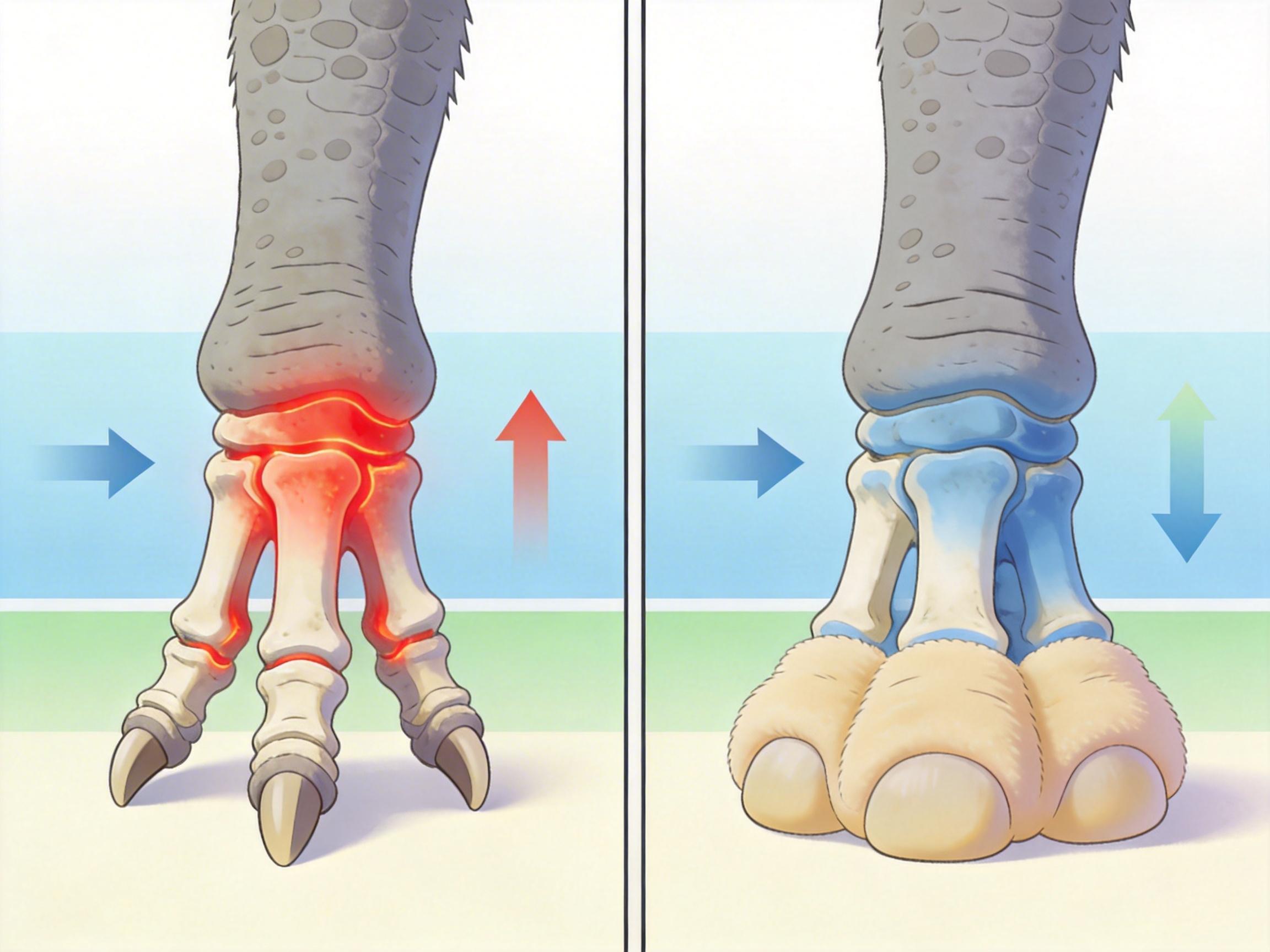 最容易被忽略的,是足底的软组织垫。研究团队通过模拟发现,如果没有类似现代大象脚底的脂肪垫,幼年蜥脚类的足部骨骼应力会飙升到数千MPa,根本无法支撑体重。这种软组织垫能吸收冲击、分散压力,相当于给骨头穿了一层“缓冲鞋垫”,让直立站立的风险大大降低。