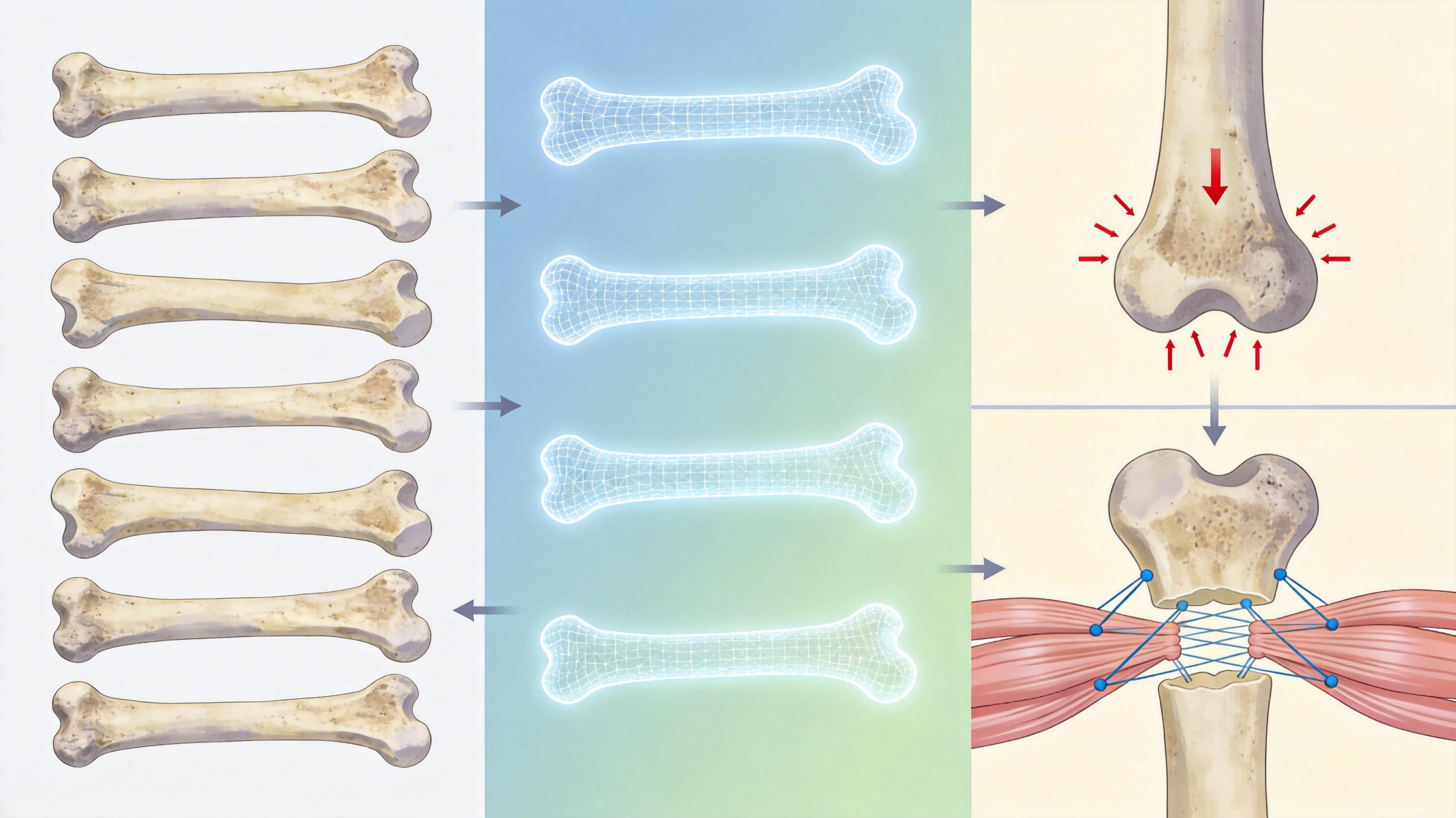 他们从全球博物馆收集了7种不同蜥脚类的股骨化石,用CT扫描重建出数字模型,再分别模拟两种场景:一种是双足站立时,体重和重力对股骨的“外部压力”;另一种是肌肉收缩时,对骨骼施加的“内部拉力”。为了让结果更准确,团队统一了模型的网格精度,还参考现代牛骨的材料属性给化石赋值。