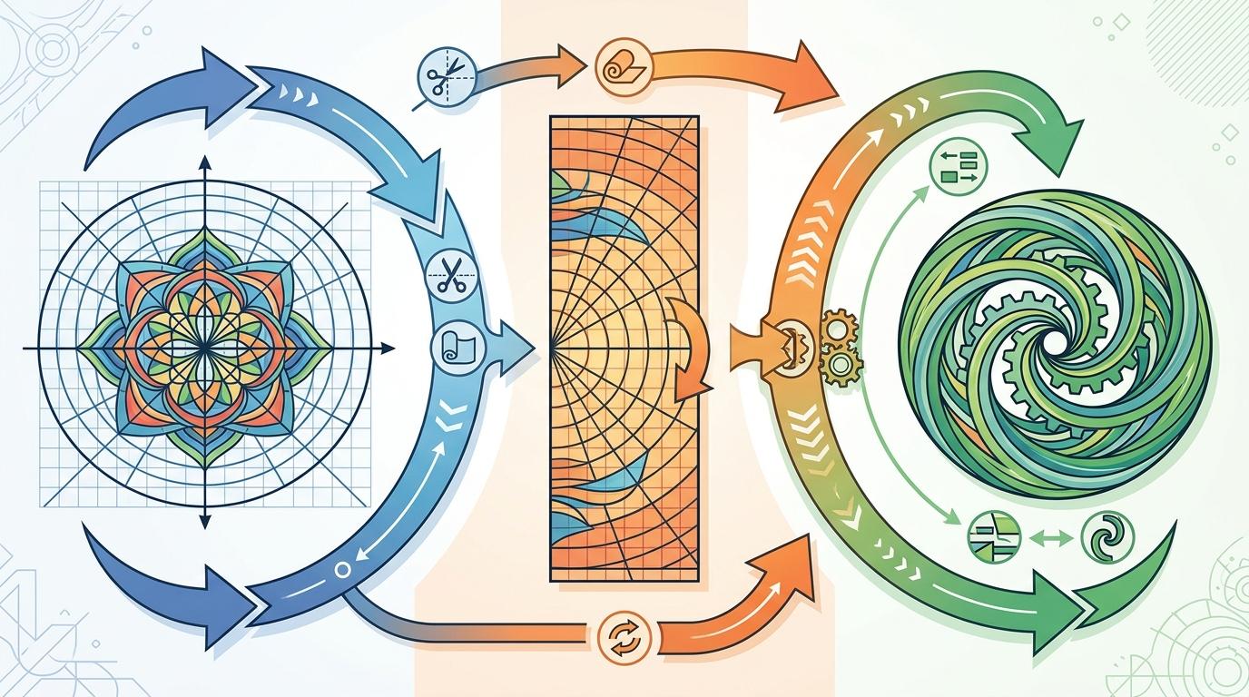 这背后的关键,是把笛卡尔坐标系里的图像“拆”成了极坐标。你可以想象把圆形的画从中心剪开,拉成一条无限长的纸条——原来的同心圆变成了纸条上的横线,角度变成了竖线。在这个纸条上旋转一定角度,再把它卷回圆形,原本独立的图像层就会像齿轮一样咬合,形成连续的螺旋。