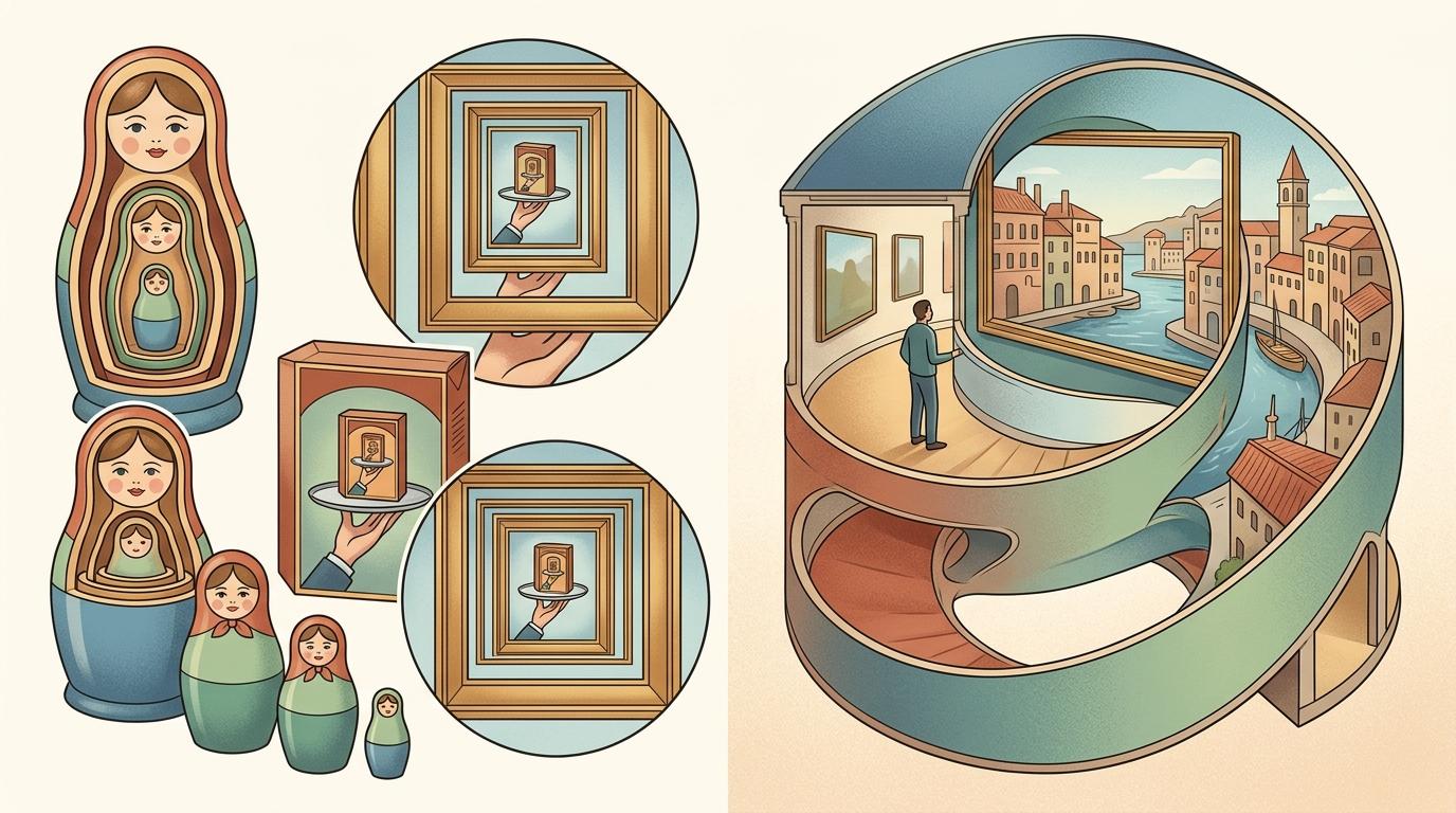 Droste效应的魔力,本质是人类认知对“无限”的好奇和对“模式”的依赖。我们的大脑天生会寻找重复的模式,递归结构刚好击中了这种认知偏好——当我们看到一幅画里有它自己,大脑会自动补全“无限嵌套”的想象,哪怕实际只有几层。