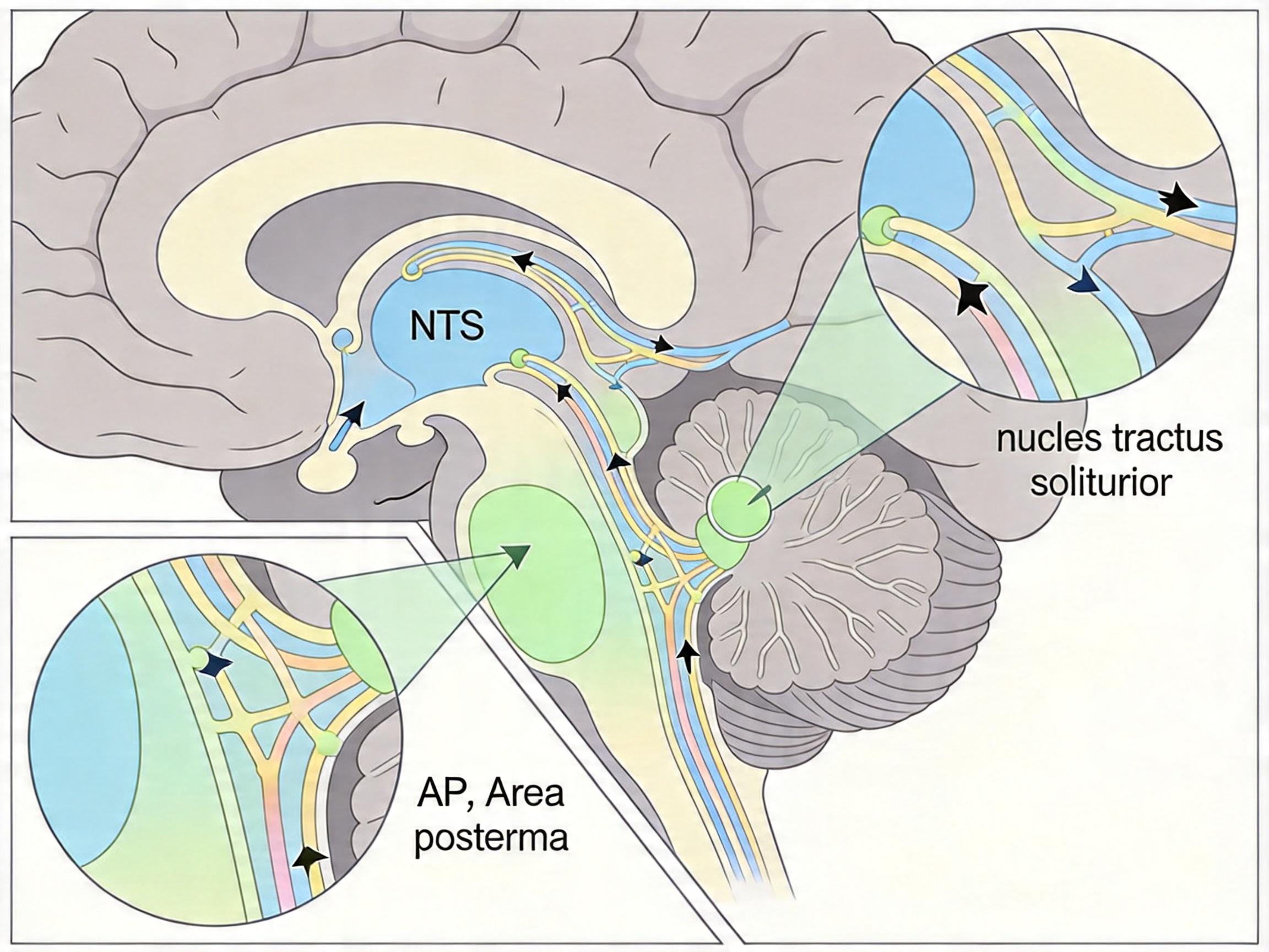 团队不得不推翻预设,重新在大脑里寻找靶点。他们用遗传标记和神经回路追踪技术一点点排查,最终把目光锁定在了脑干后部的孤束核(NTS)和终板区(AP)。这两个区域像大脑里的“代谢接线盒”,专门负责接收身体各处传来的代谢信号,再把指令传递给全身。