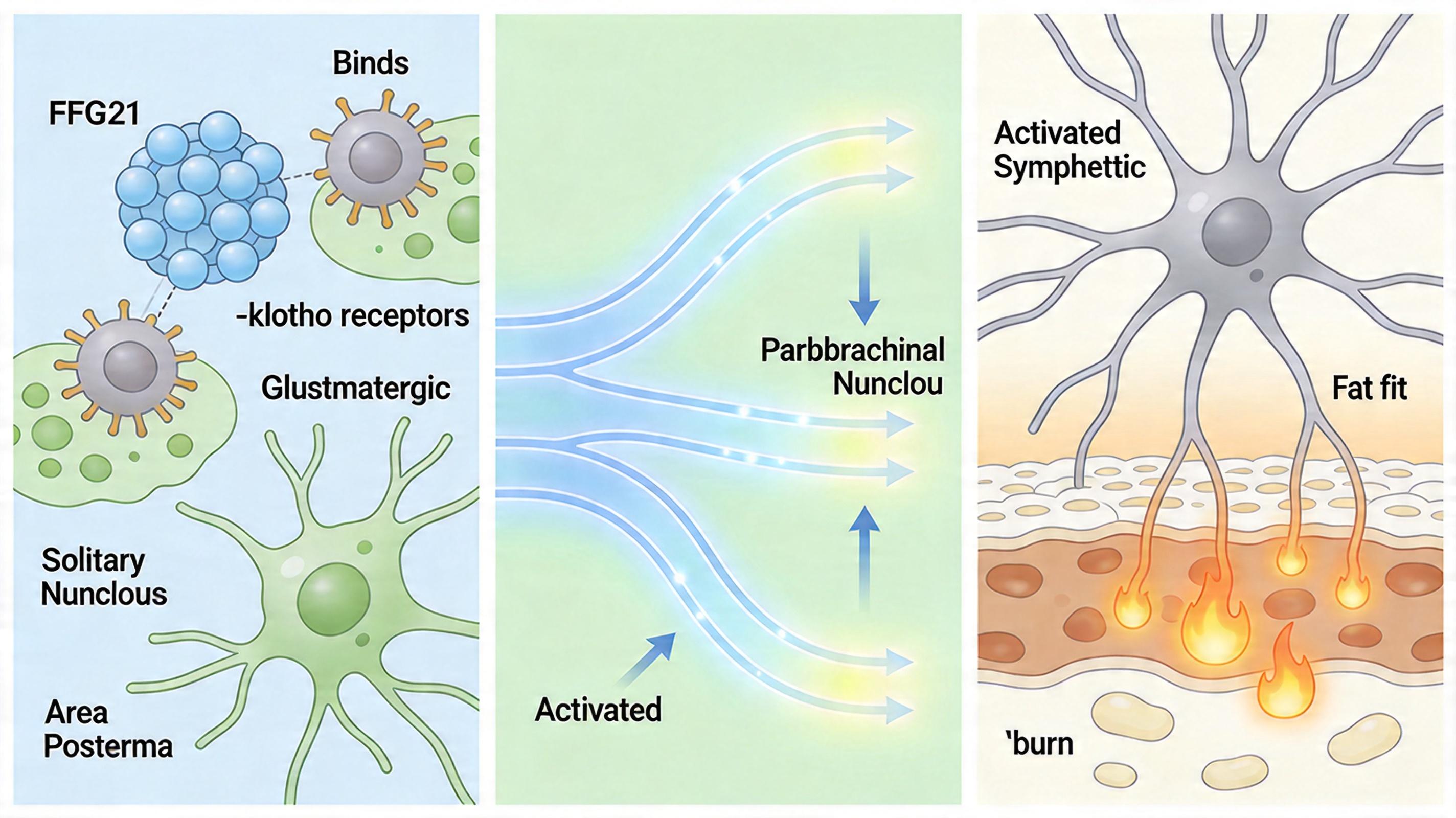 更关键的是,FGF21需要和神经元表面的β-klotho受体结合才能发挥作用,而这种受体在孤束核和终板区的谷氨酸能神经元上大量存在。当FGF21激活这些神经元后,信号会顺着神经通路传到旁脑桥核,最终触发交感神经系统兴奋,让棕色脂肪组织开始“燃烧”——就像给身体打开了一个不依赖运动的“发热模式”。
