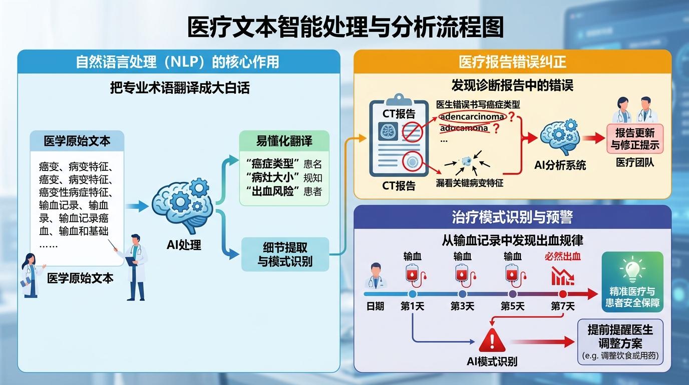 这套流程的核心,是AI的自然语言处理能力——它能把满是专业术语的医疗文本,翻译成普通人能懂的大白话,还能从海量信息里揪出人类容易忽略的细节。比如一次CT报告里,AI发现医生把母亲的癌症类型写错了3次,还漏看了两处关键的病变特征;又比如它从连续的输血记录里,发现了“输血后第7天必然出血”的规律,提前提醒医生调整饮食方案。