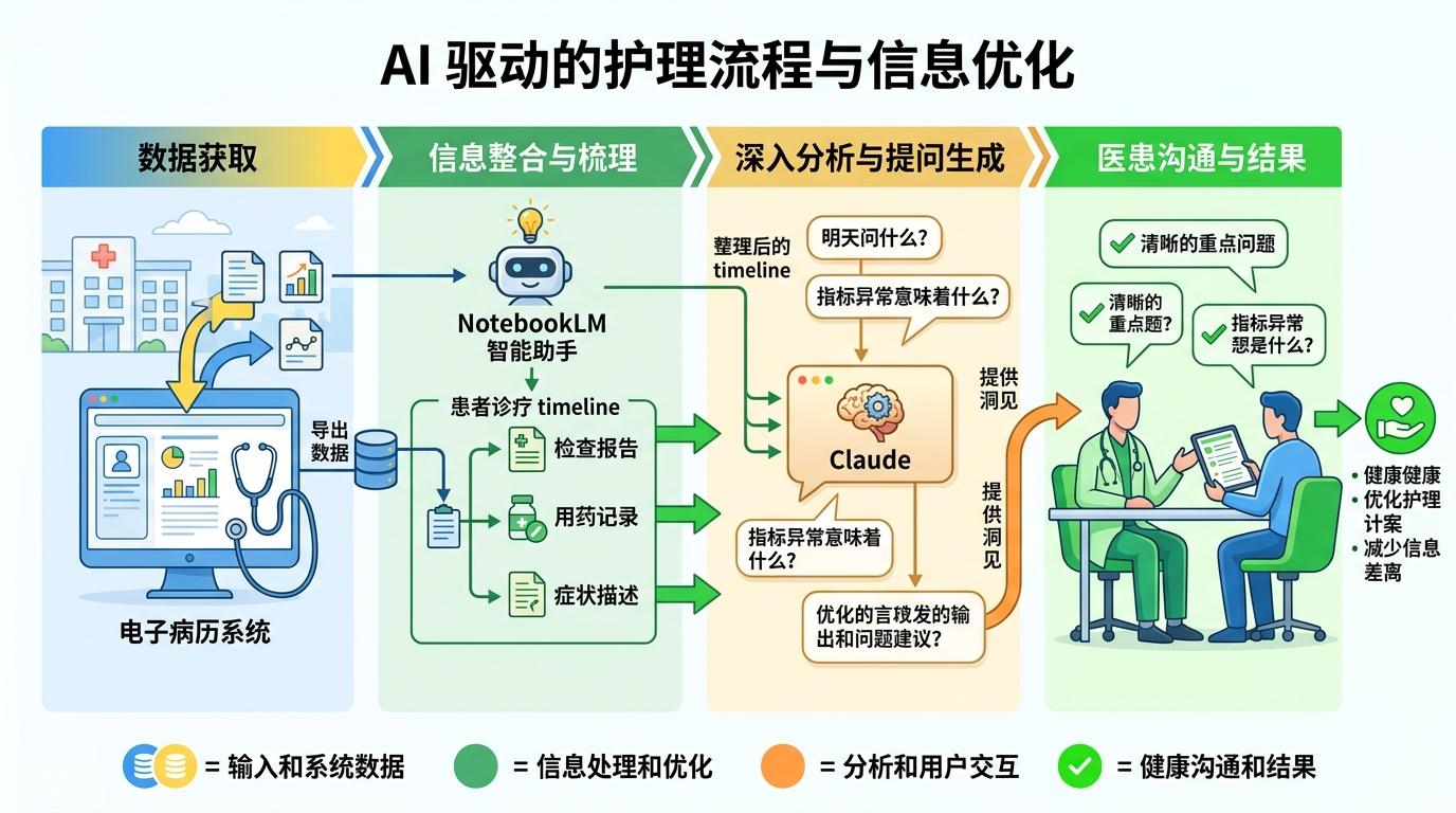 Pratik的AI护理流程,说穿了就是用技术把“信息差”砸出一个口子。他每天从医院的电子病历系统导出数据,先喂给NotebookLM做信息整合——这个AI工具能像资深医助一样,把零散的检查报告、用药记录、症状描述自动梳理成清晰的诊疗 timeline。接着他会把整理好的内容发给Claude,用自然语言提问:“明天见医生我该重点问什么?这个指标异常意味着什么?”