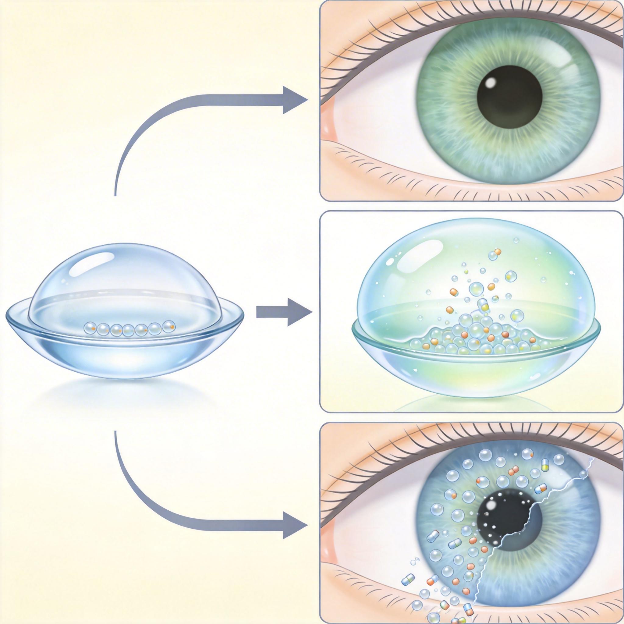 更巧妙的是它的“诊疗闭环”设计。镜片的水凝胶层里藏着微胶囊包裹的降眼压药物,当传感器监测到眼压超过阈值,微胶囊的外壳就会响应机械信号破裂,把药物精准释放到眼表。这相当于给眼睛配了个24小时在岗的私人医生,既解决了患者漏滴眼药水的依从性难题,又避免了长期用药的全身性副作用。
