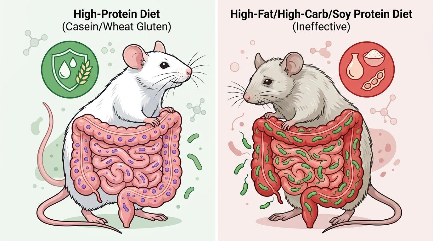 研究者给感染了霍乱弧菌的小鼠喂了三种不同饮食:高脂肪、高碳水,以及富含酪蛋白(牛奶奶酪的核心蛋白)和小麦麸质的高蛋白餐。结果一目了然:高脂饮食基本没作用,高碳水饮食只有微弱效果,而高蛋白餐几乎完全阻断了霍乱弧菌在肠道里的扎根。更关键的是,不是所有蛋白都有效——大豆蛋白就没展现出这种抑制力,只有酪蛋白和小麦麸质成了明确的“抗菌选手”。