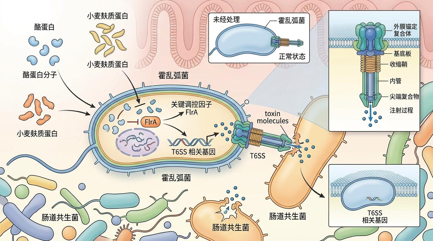 要理解这背后的逻辑,得先认识霍乱弧菌的致命武器:第六型分泌系统(T6SS)。这是一种长在细菌表面的纳米级注射器,能向周围的肠道共生菌注射毒素,把竞争对手赶尽杀绝,从而霸占肠道生态位。而酪蛋白和小麦麸质的作用,就是精准“缴械”这个注射器——它们会抑制霍乱弧菌里的关键调控因子FlrA,让T6SS的基因表达大幅下调,相当于抽走了病菌的弹药。