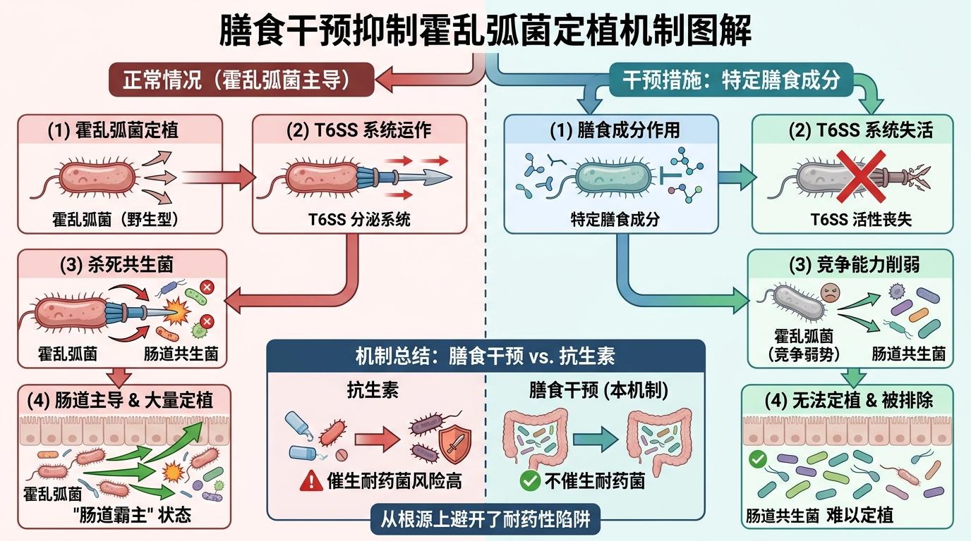 没有了T6SS的加持,霍乱弧菌瞬间从“肠道霸主”跌成了“弱势选手”。它没法再杀死共生菌,只能在肠道里和其他微生物抢地盘,自然难以大量定植。更值得关注的是,这种饮食干预不会像抗生素那样催生耐药菌——毕竟它没有直接杀死细菌,只是削弱了病菌的竞争能力,从根源上避开了耐药性的陷阱。