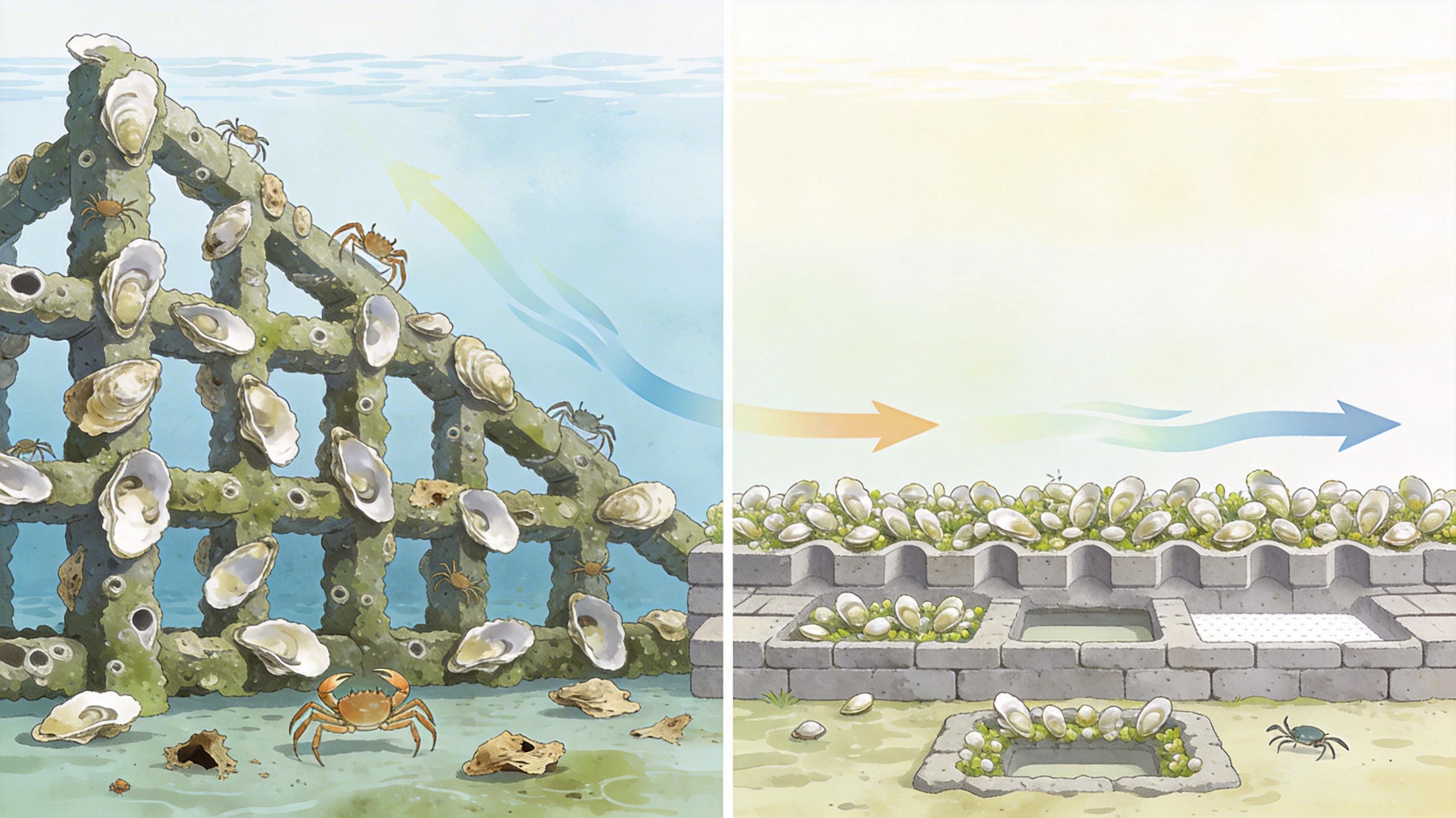 这就像给刚破壳的小鸟搭窝,不是要建摩天大楼,而是要刚好能遮风挡雨、躲开天敌的小巢。自然的设计逻辑从来都是精准的:每个壳缝的宽度、脊状的高度,都刚好适配幼牡蛎的体型,既能让水流带来食物,又能把捕食者挡在外面。那些看似杂乱的天然礁体,其实是经过无数代筛选的最优解。