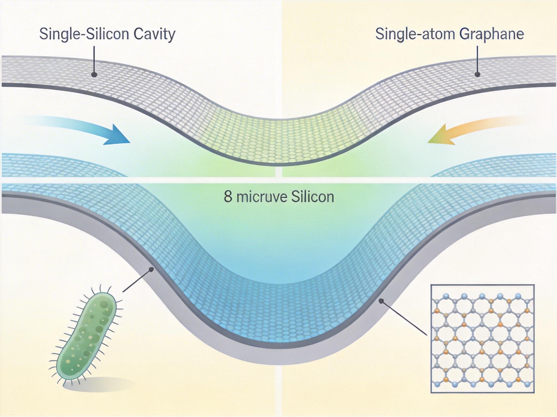 你可以把这面纳米鼓理解成一个超迷你的蹦床:直径8微米的硅基凹腔上,绷着两层石墨烯薄膜——薄到只有一个碳原子层的厚度,却比钢铁强200倍,还能像保鲜膜一样跟着微小力道变形。这个尺寸刚好能容下单个细菌,毕竟大部分细菌的长度只有1到10微米。