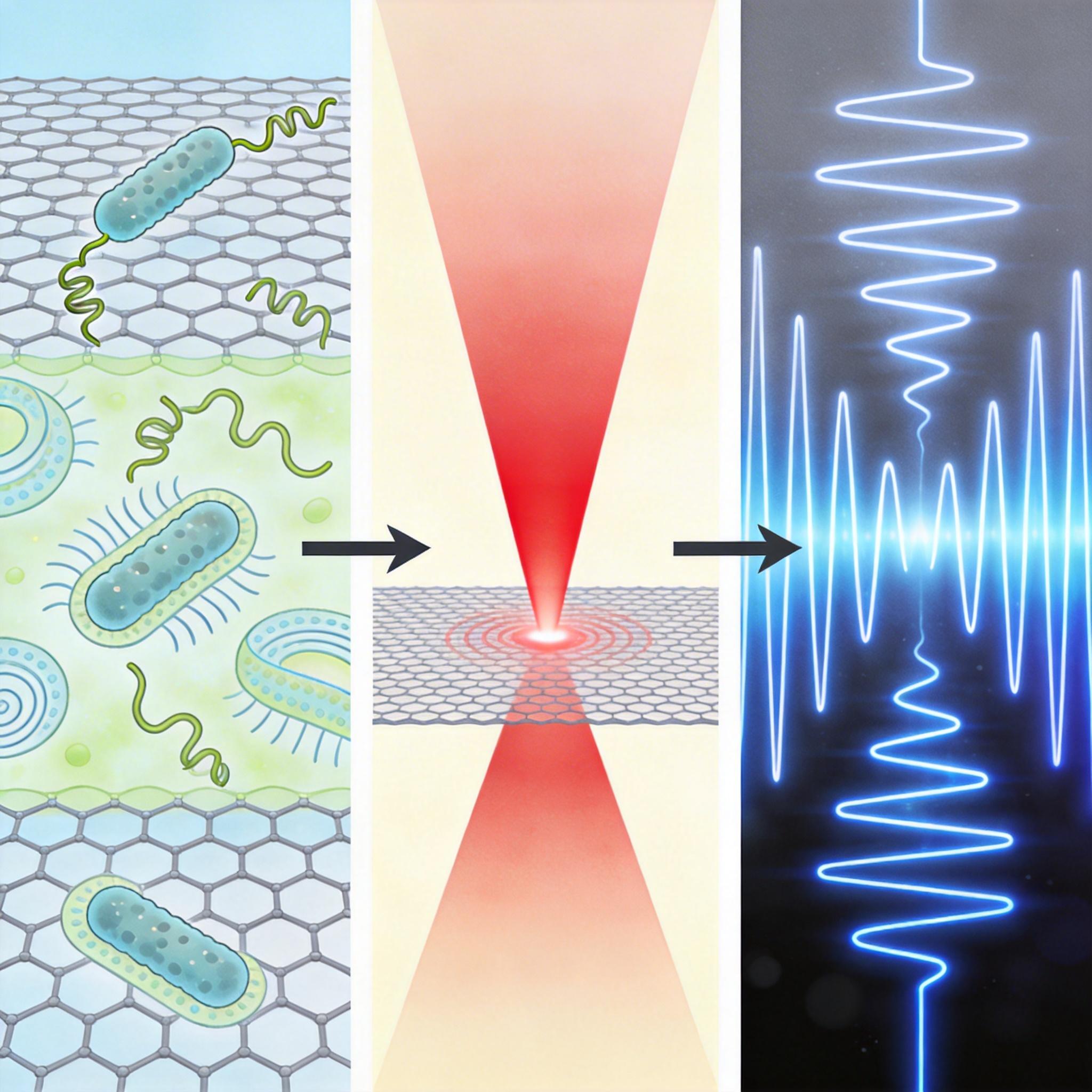 当活细菌落在鼓面上,它的鞭毛会像螺旋桨一样转动,细胞壁会悄悄舒张收缩,这些连显微镜都看不清的动作,会带着石墨烯膜一起振动。研究人员用激光照在鼓面上,膜的微小变形会让反射光的强度发生变化,再把光信号转换成电信号——就像把细菌的“鼓点”录了下来。