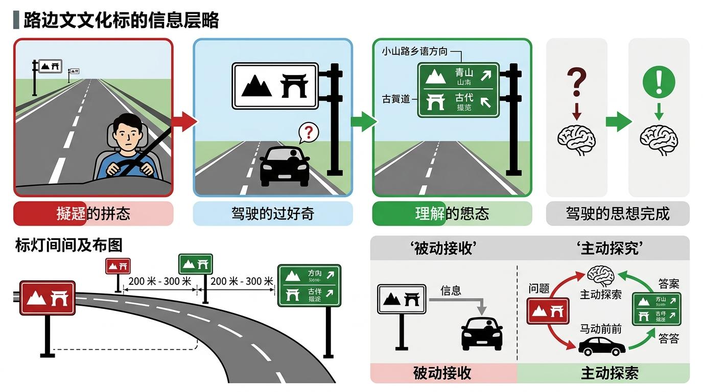 更巧妙的是信息分层策略:路牌以200到300米的间距成对出现,第一块只展示符号,用悬念勾起好奇心;第二块补充文字和方向,完成信息闭环。这种“谜题-答案”的结构,既符合高速驾驶的认知节奏,也让文化传递从被动接收变成主动探索。