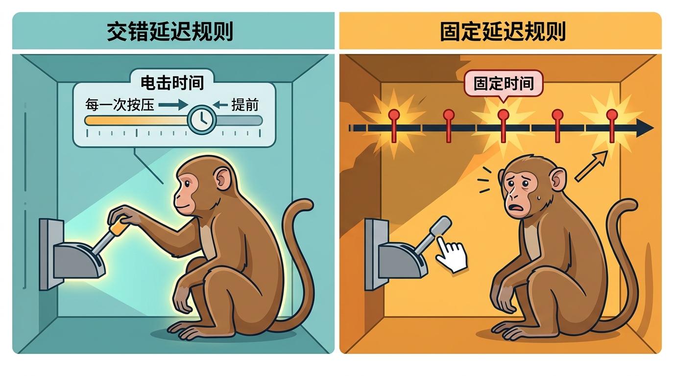 Kelleher和Morse的实验把这个逻辑推到了极致:在「交错延迟规则」下,每按一次杠杆,电击就会提前一点到来,但猴子只要保持按压,就能精准控制电击的时间节奏;而在「固定延迟规则」下,按不按杠杆,电击都会在固定时间出现,猴子完全失去控制权。