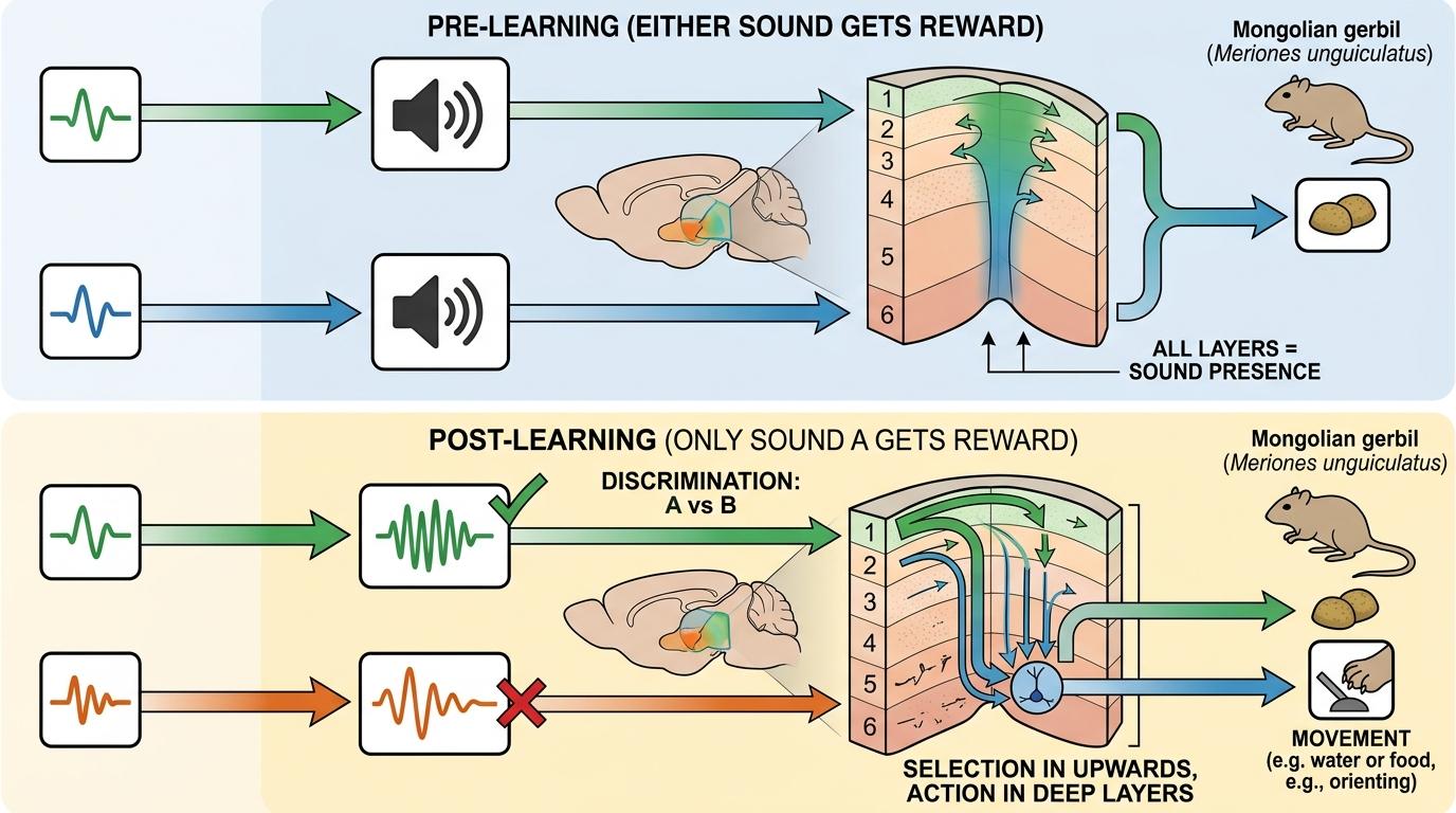 蒙古沙鼠的听觉皮层研究,把这套系统拆解得更清晰:当训练沙鼠区分两种音频,一开始「两种音频都能触发奖励」的规则下,听觉皮层的所有层级都只负责编码「声音来了」这个信息;而当规则变成「只有A音频能触发奖励」后,上层皮层立刻切换模式,开始编码「这是A还是B」的选择信息,深层皮层则负责把选择转化为行动。