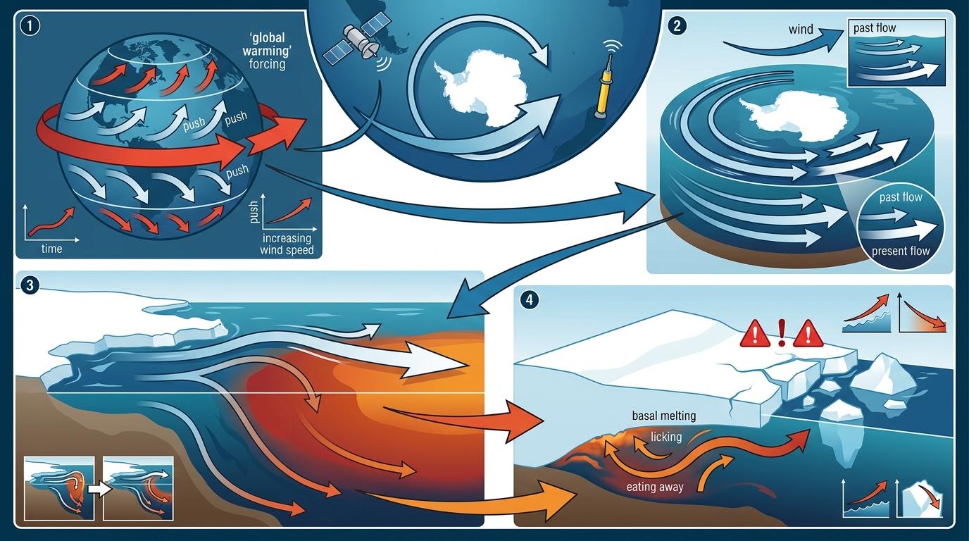 过去几十年,卫星和Argo浮标观测到一个反常的现象:南极绕极洋流的流速在加快。原因很简单——全球变暖让南半球西风带更强了,相当于给这台‘地球引擎’踩了油门。但这可不是什么好事:流速加快的洋流会带着更多温暖海水冲向南极冰架底部,加速冰架融化。
