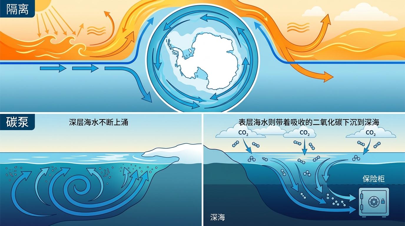南极绕极洋流成型后,做的第一件事就是‘隔离’——它像一道流动的墙,把温暖的亚热带海水挡在南极圈外,让南极周围的海水持续降温。这还不够,它还启动了地球的‘碳泵’:强劲的环流让深层海水不断上涌,表层海水则带着吸收的二氧化碳下沉到深海,像把温室气体锁进了地球的保险柜。