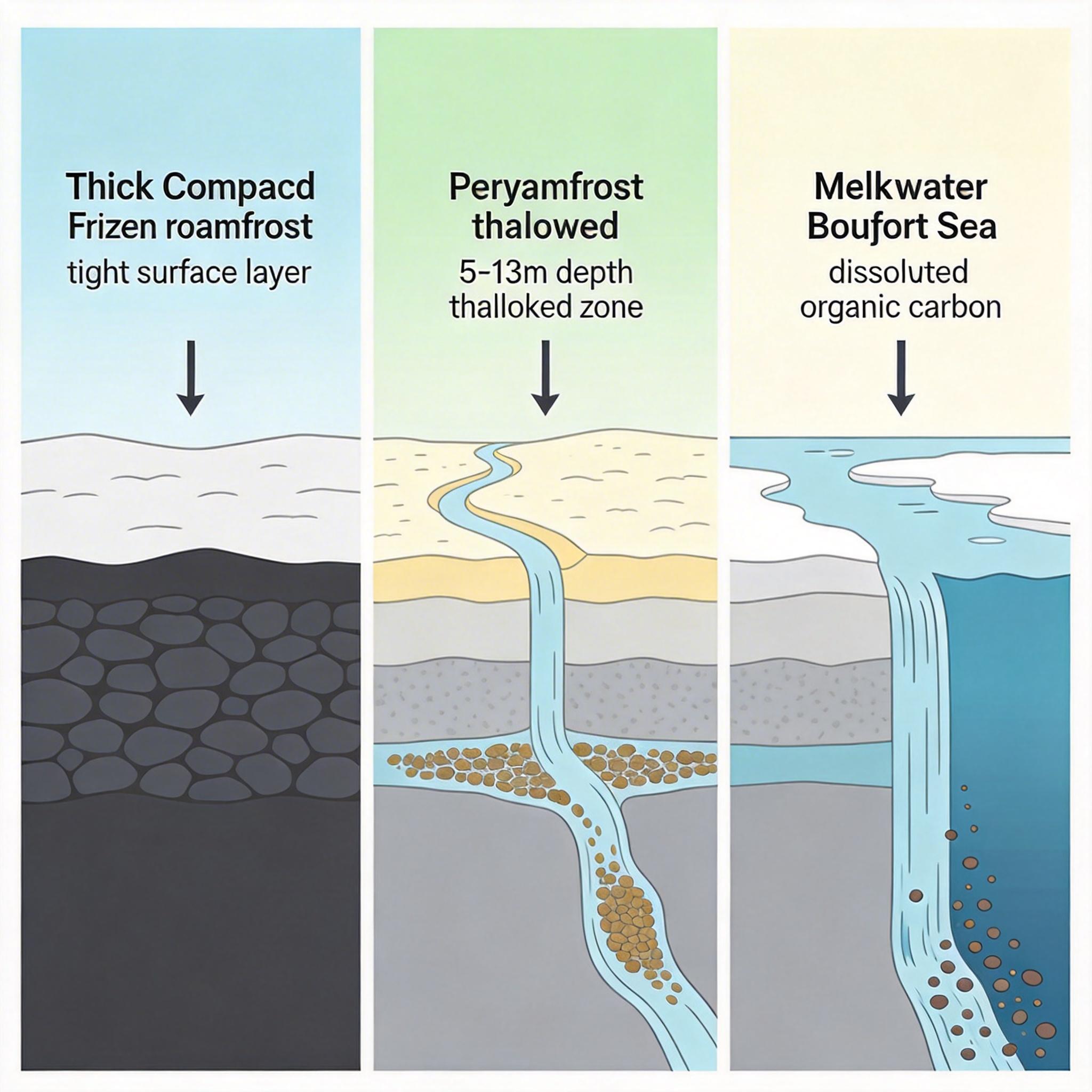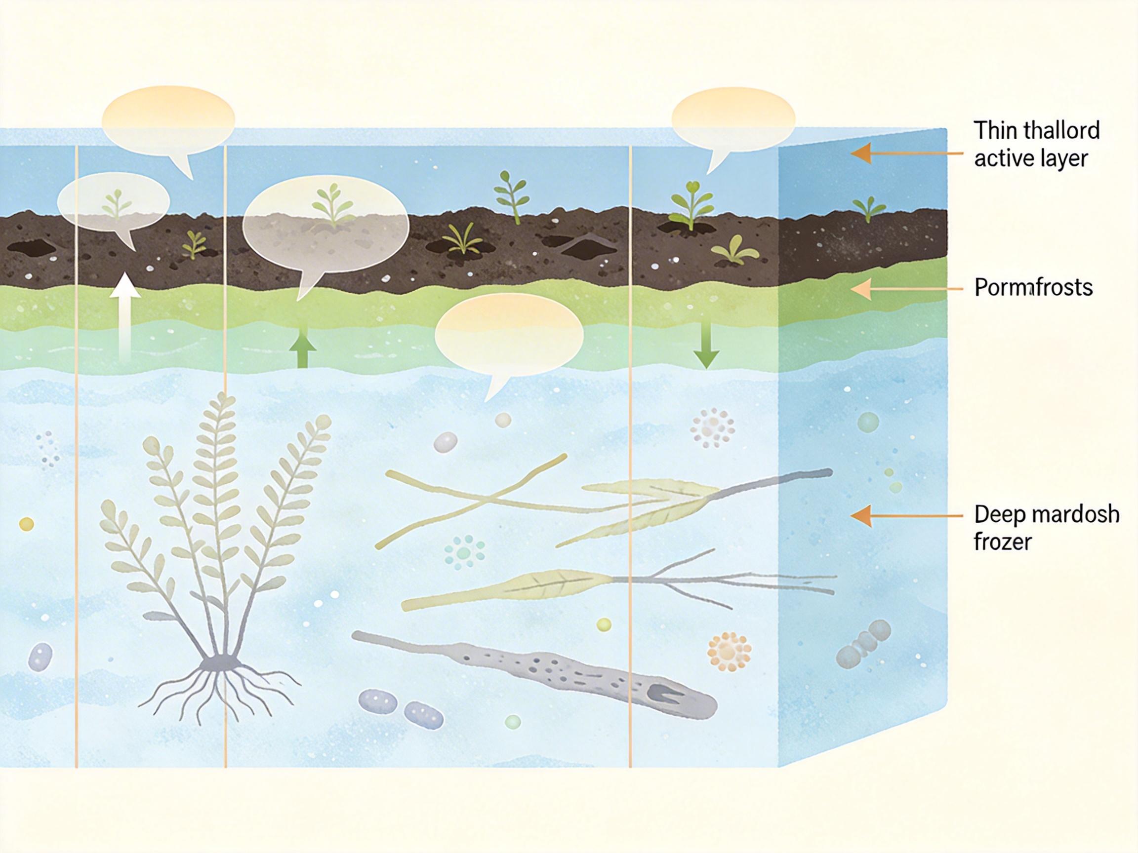 你可以把永久冻土想象成一个天然的巨型冰箱——零下几十度的环境里,几万年前的植物残骸、微生物尸体被冻得结结实实,连分解它们的细菌都陷入了休眠。而冰箱最上层的“活跃层”,就是每年夏天会融化、冬天再冻上的那层土,原本像个盖子,把深层的古老碳牢牢封在里面。