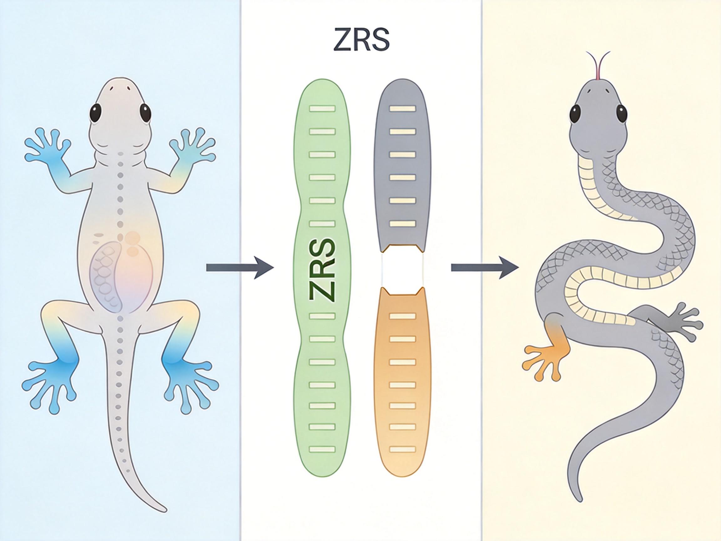 科学家对比了蛇类和蜥蜴的基因组,发现负责肢体发育的Shh基因本身并没有缺失,只是它的调控序列ZRS发生了突变。ZRS就像一个开关,专门控制Shh基因在肢体末端的表达。在蜥蜴等有腿动物里,这个开关是打开的;而在蛇类里,这个开关的关键片段缺失了17个碱基对,导致Shh基因无法在肢体末端激活,腿的发育到胚胎阶段就停滞了。
