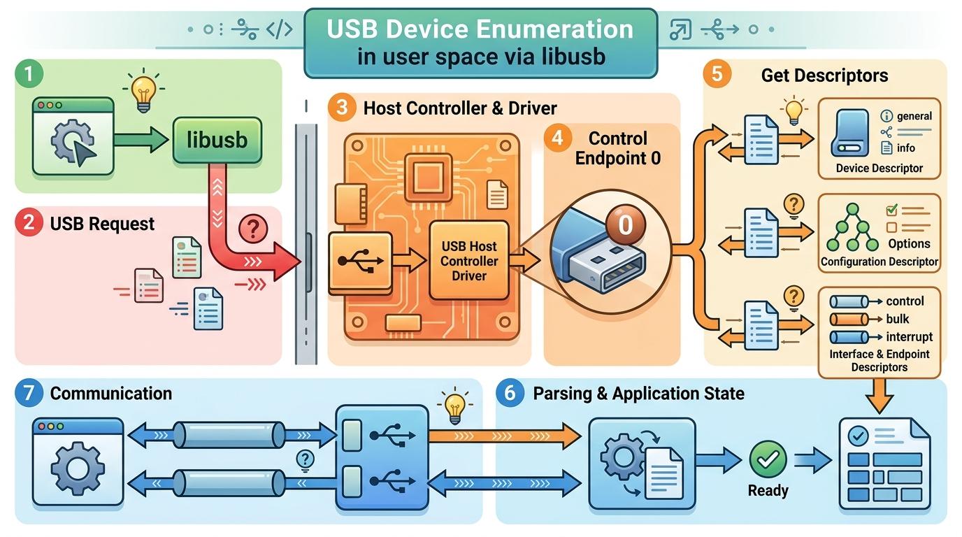 要让用户态程序和USB设备对话,得先过「枚举」这一关——这是主机识别设备、获取设备信息的过程。你可以把它想象成快递员上门:先问清你是谁(设备描述符)、住在哪(端点信息)、能收什么快递(传输类型)。在用户态下,libusb会帮你完成这个流程:它向设备的控制端点(固定在0号)发送标准请求,获取设备的描述符、配置、接口和端点信息,你要做的只是解析这些数据。