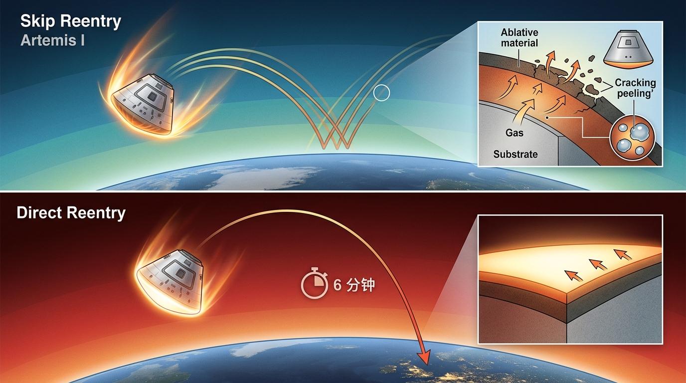 而支撑这一切的,是一块看起来不起眼的烧蚀热盾。猎户座飞船用的Avcoat材料,和阿波罗时代的配方一脉相承——靠自身烧蚀带走热量,就像用蜡烛的燃烧保护蜡芯。但Artemis I任务的意外给了NASA当头一棒:跳跃式再入轨迹让热盾内部的气体无法及时排出,导致表层开裂剥落。这次他们没换材料,而是直接改了轨迹——放弃“弹跳”式再入,让飞船一头扎进大气层,把热盾的受热时间缩短了6分钟。这是务实的妥协,也是无奈的选择:现有材料的透气性瓶颈,还没找到完美的解决方案,只能用轨迹设计来弥补。