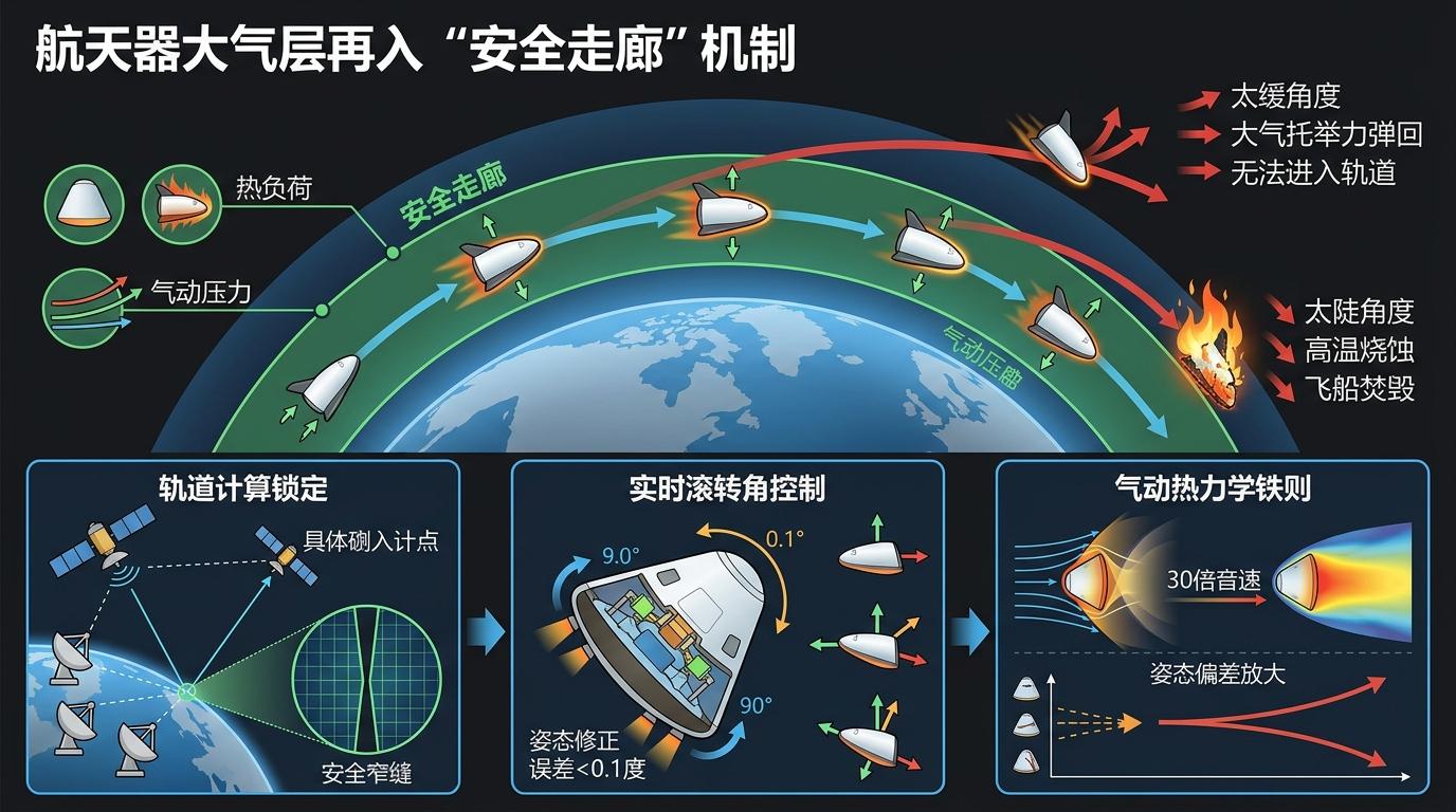 答案藏在地球大气层那层看不见的“安全走廊”里。这条走廊的上下边界,是热负荷与气动压力共同划定的死亡线:角度太陡,飞船会像流星一样被高温烧蚀;角度太缓,大气的托举力会把它“弹”回太空。为了精准命中这条窄缝,NASA的团队用了一套类似“用狙击枪打移动靶”的逻辑——先通过轨道计算锁定走廊位置,再用实时调整的滚转角控制航向,每一秒的姿态修正,都要把误差压缩到0.1度以内。这不是玄学,是气动热力学的铁则:当速度达到30倍音速时,任何微小的姿态偏差,都会被大气放大成致命的轨迹偏移。